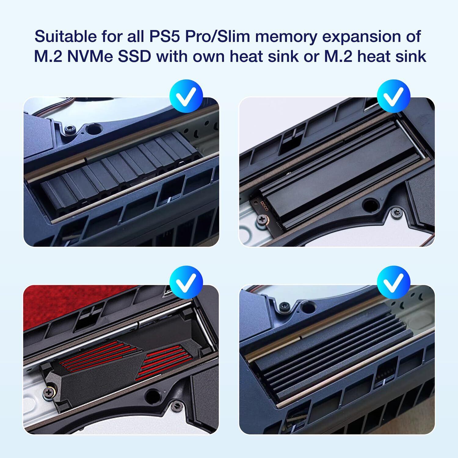 【ヒートシンク付きM.2 SSDが適している】ほとんどのヒートシンクは、ヒートシンクが統合された m.2 SSD には適合しませんでしたが、このカバーはこの目的のために作られています。WD Black SN850P、Samsung 980 PRO、Kingston FURY Renegade、AORUS 7000s、FireCuda 530、CORSAIR MP600 PRO、PNY XLR8 CS3140、XPG GAMMIX S70 BLADE、Nextorage NEM、ADATA Premier SSD などの統合ヒートシンク付き SSD と組み合わせて使用し、SSD を冷却性能を底上げしオーバーヒートを予防します