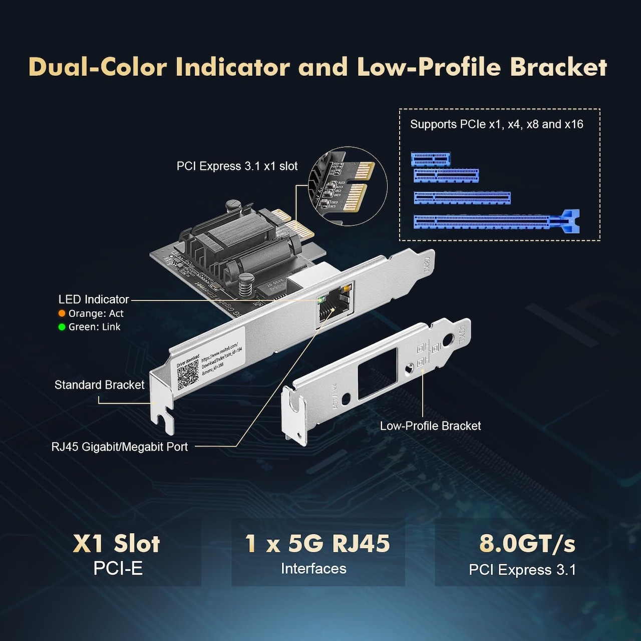 5G PCIe ネットワークアダプター RTL8126 5G/2.5G/1G/100Mbps Binardat イーサネットカード RJ45 LANコントローラー ロープロファイル付き Windows 11/10 Linux用 PXE対応