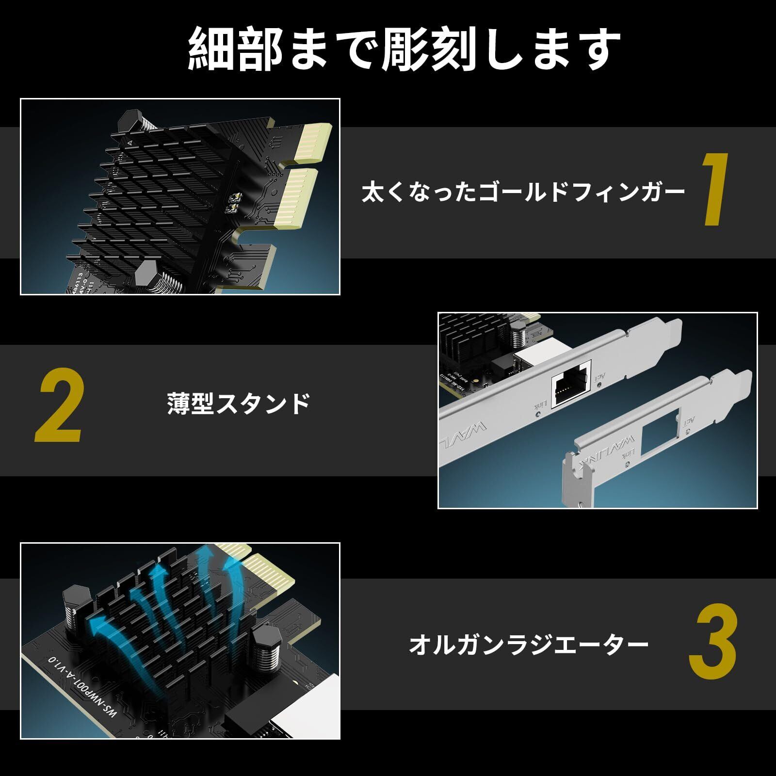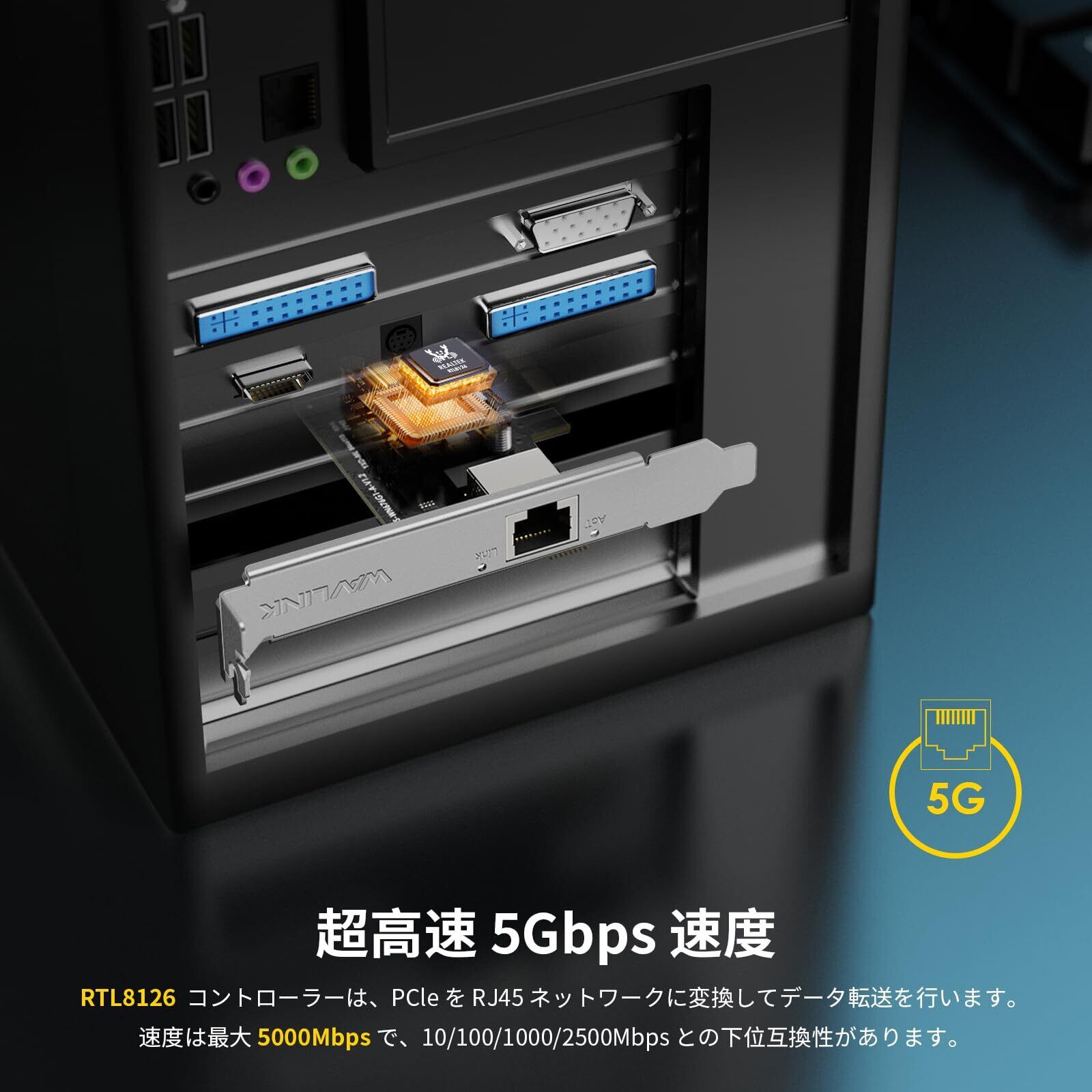 WAVLINK 5G Base-T LANカード PCIEネットワーク カード、5000/2500/1000Mbps PCI Express イーサネット アダプター、RTL8126 搭載、Windows 11/10 および Linux 用 5G NIC、ロー プロファイル ブラケット付き