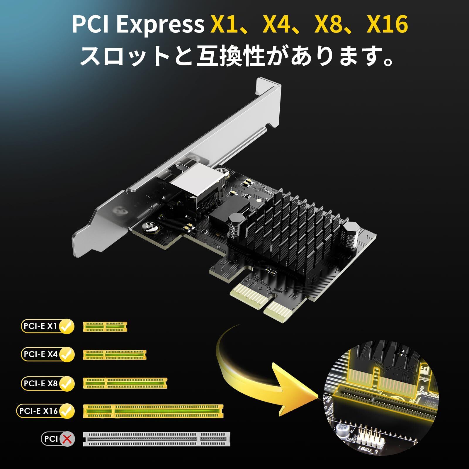 PCIe から 5G RJ45: x1、x4、x8、x16 を含むさまざまな PCI Express スロット構成をサポートし、さまざまなマザーボード間でシームレスなインストールと互換性を確保し、さまざまなハードウェア レイアウトとニーズに対応します。注意: PCI-E スロットのみと互換性があり、PCI スロットとは互換性がありません。