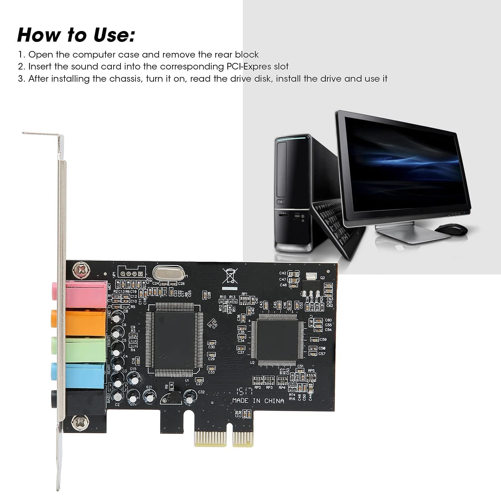 5.1 用の内部サウンドカード、PCIE サウンドカード、6 チャンネルサラウンドサウンドコンピュータサウンドカード PC コンピュータシステムをサポート、PCI-E ~ 3.5mm X 5、カラオケホームシアター用