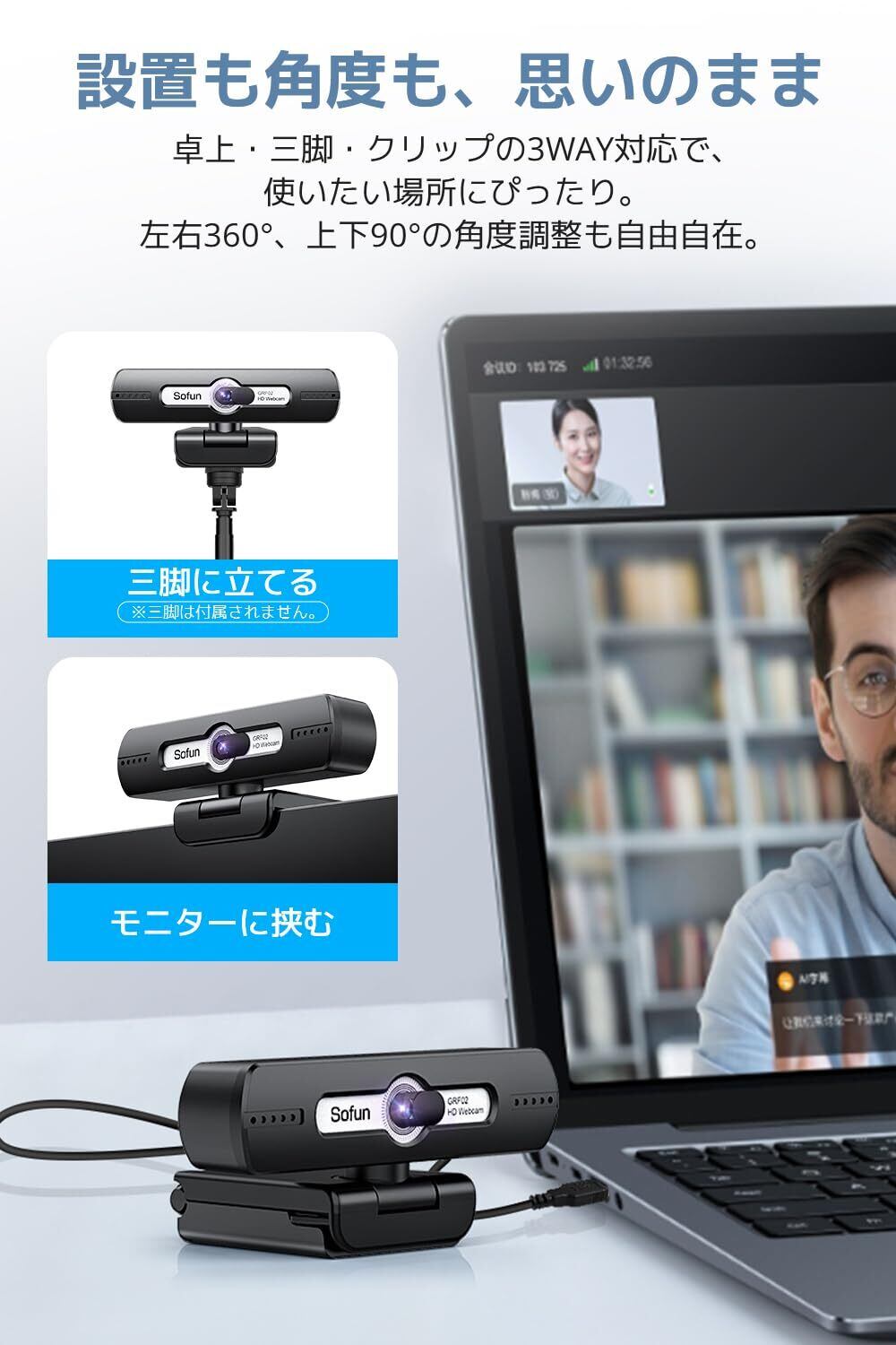 【90°広角レンズ&360°角度調整・柔軟な設置対応】90度の 広角レンズ を搭載し、個人使用はもちろん、複数人のミーティングにも対応。さらに左右360度・上下90度の角度調整が可能で、どんな角度からでも思い通りのアングルで撮影できる Webカメラ 広角 。三脚・クリップ・卓上の3WAY設置にも対応しており、柔軟に使える外付けカメラとしてあらゆる使用シーンにフィットする 外付けカメラ 。