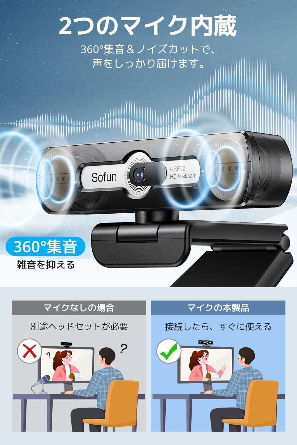 【マイク内蔵&ノイズキャンセリング対応】360°全方向から集音可能なデュアル マイク内蔵 Webカメラ 。ノイズカット機能により、環境音を抑えながらクリアな音声を相手に届けます。別途ヘッドセットが不要で、接続するだけで即使用可能な Webカメラ 。ZoomやSkype、Google Meetなど主要アプリに対応しており、在宅勤務やビデオ通話でも快適に使える 会議用カメラ です。