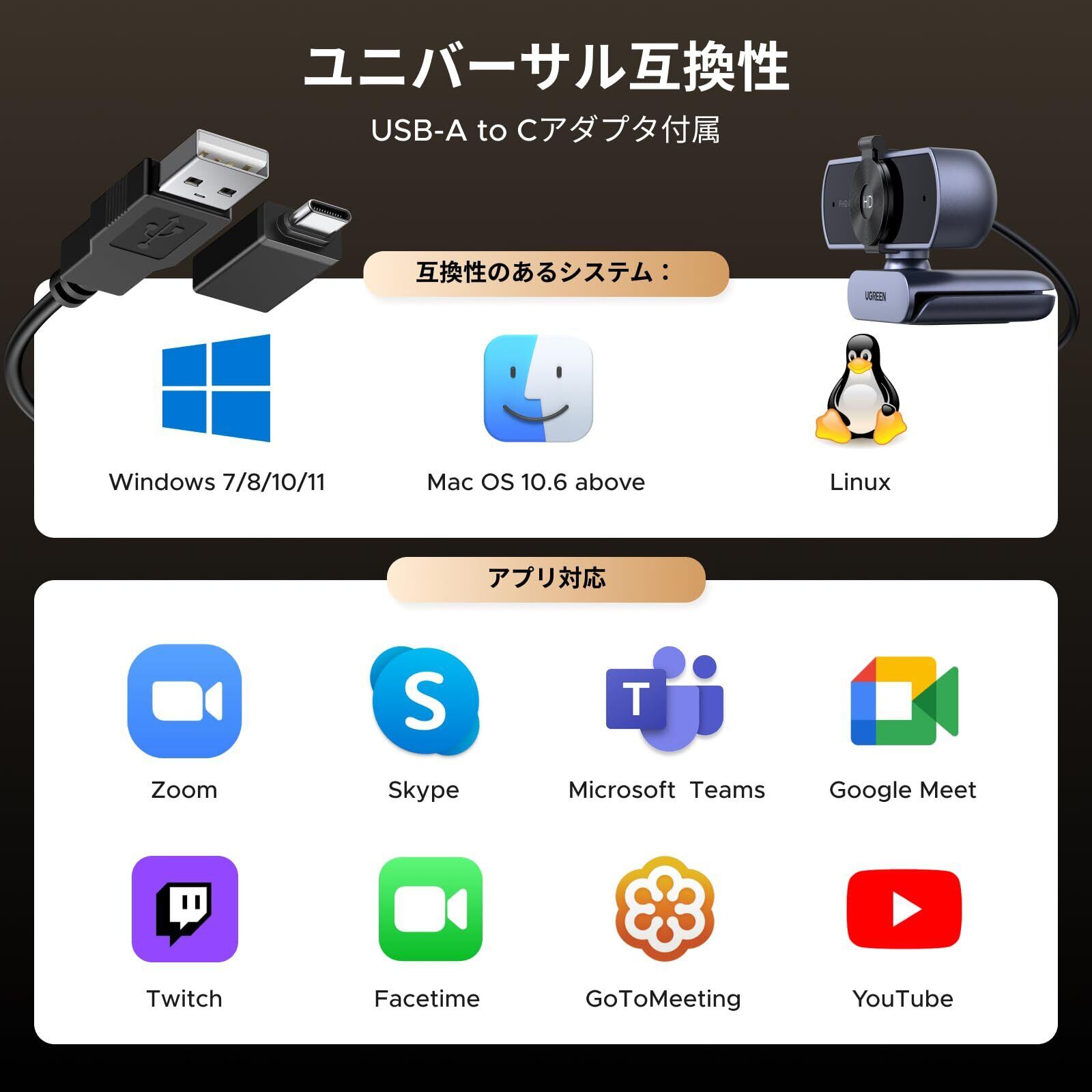 UGREEN 4K ウェブカメラ PC用 Ultra HD 1080P 60FPS Webカメラ、マイク付き、プライバシーカバー、70° Fov、PDAF オートフォーカス、USB A&USB C アダプター、プラグ&プレイ、ストリーミング/Skype/Zoom用 在宅勤務・授業・会議用 Windows 7/8/10/11、Mac OS、Linux対応