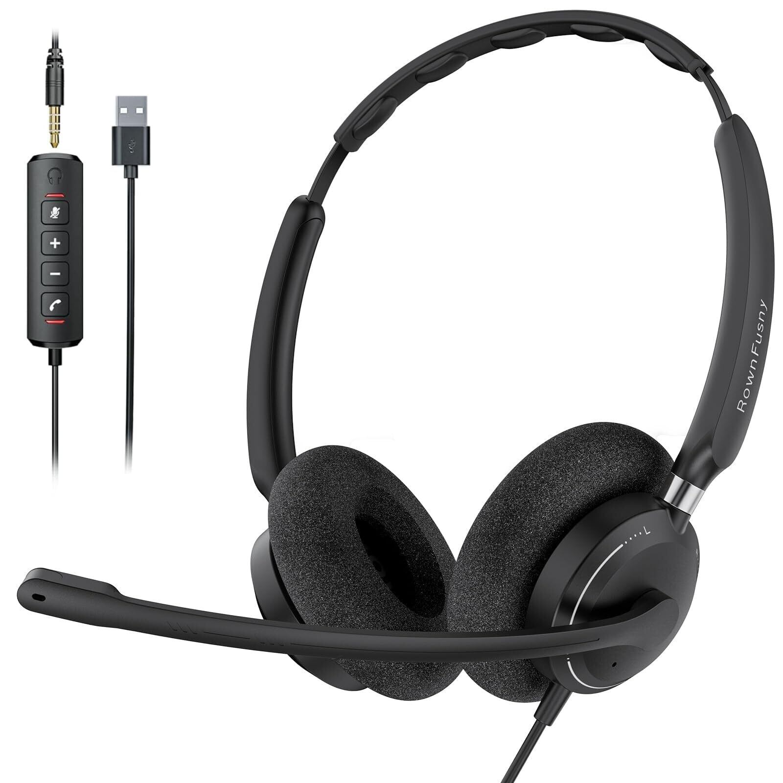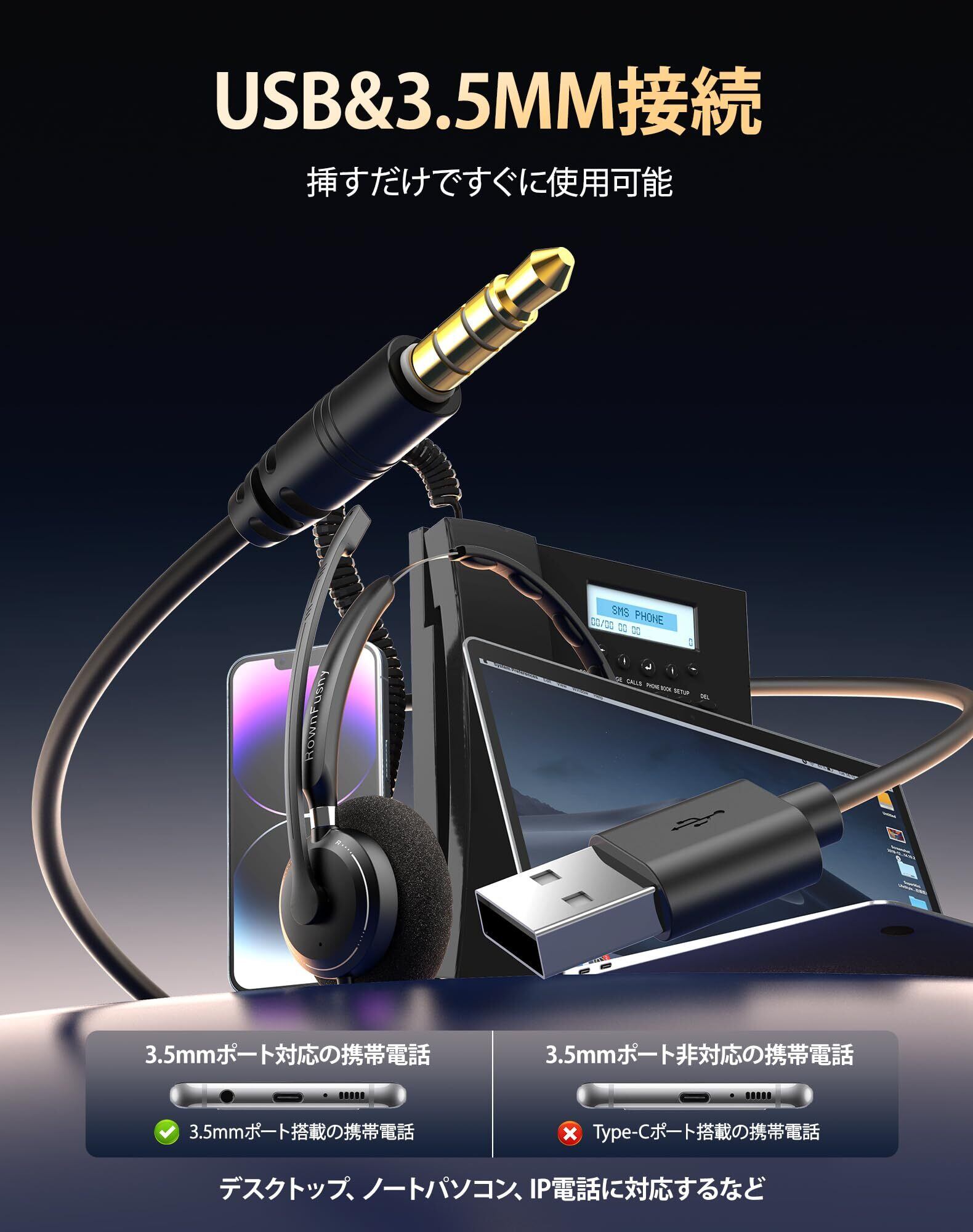 Rownfusny R06 ヘッドセット マイク付き ノイズキャンセリングマイク、USB 3.5mm接続 、軽量デザイン メモリーイヤークッション フォームクッションで一日中快適、MSチーム Web会議用 Skype、在宅勤務、業務用、リモートワーク、PCコールセンターに適用される(ブラック) (両耳)
