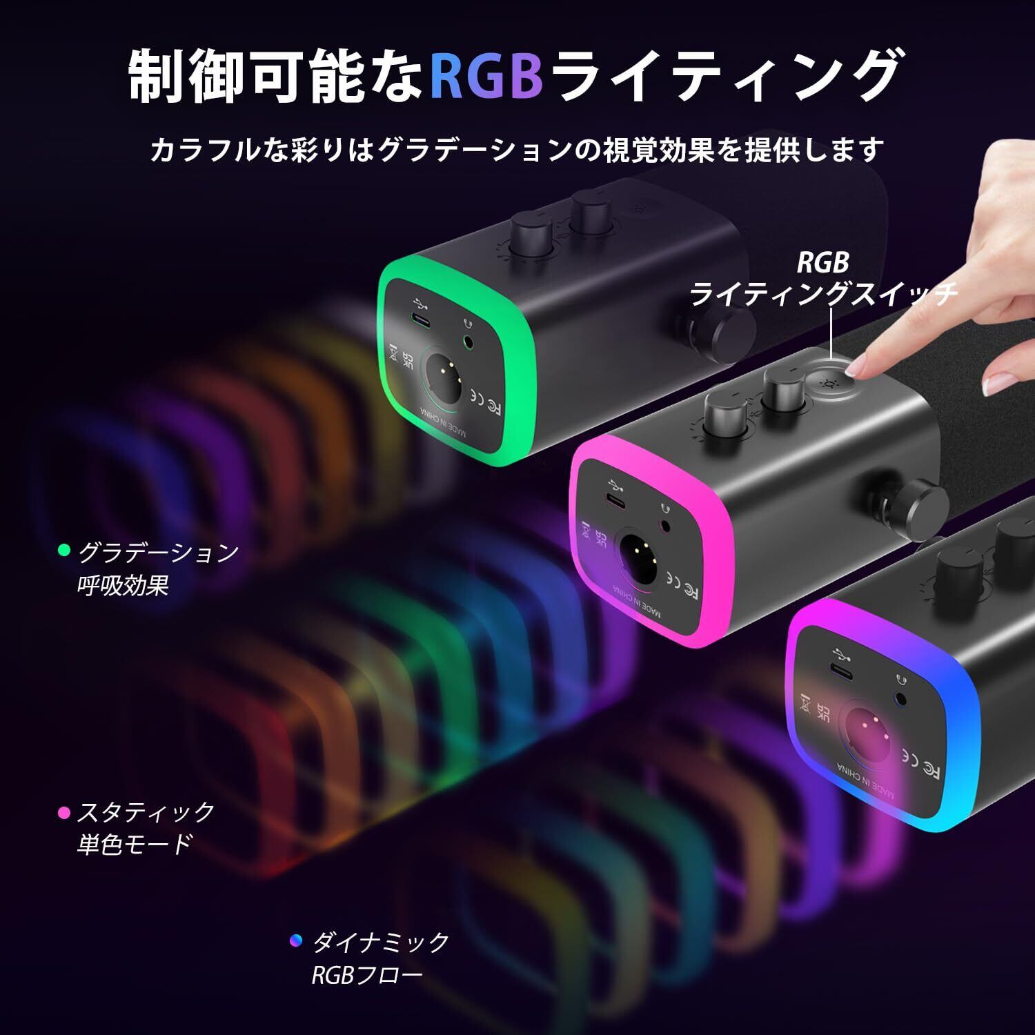 特徴 RGBライト, XLR/USB接続, ヘッドホン端子付き, マイク音量調節, ミュート機能