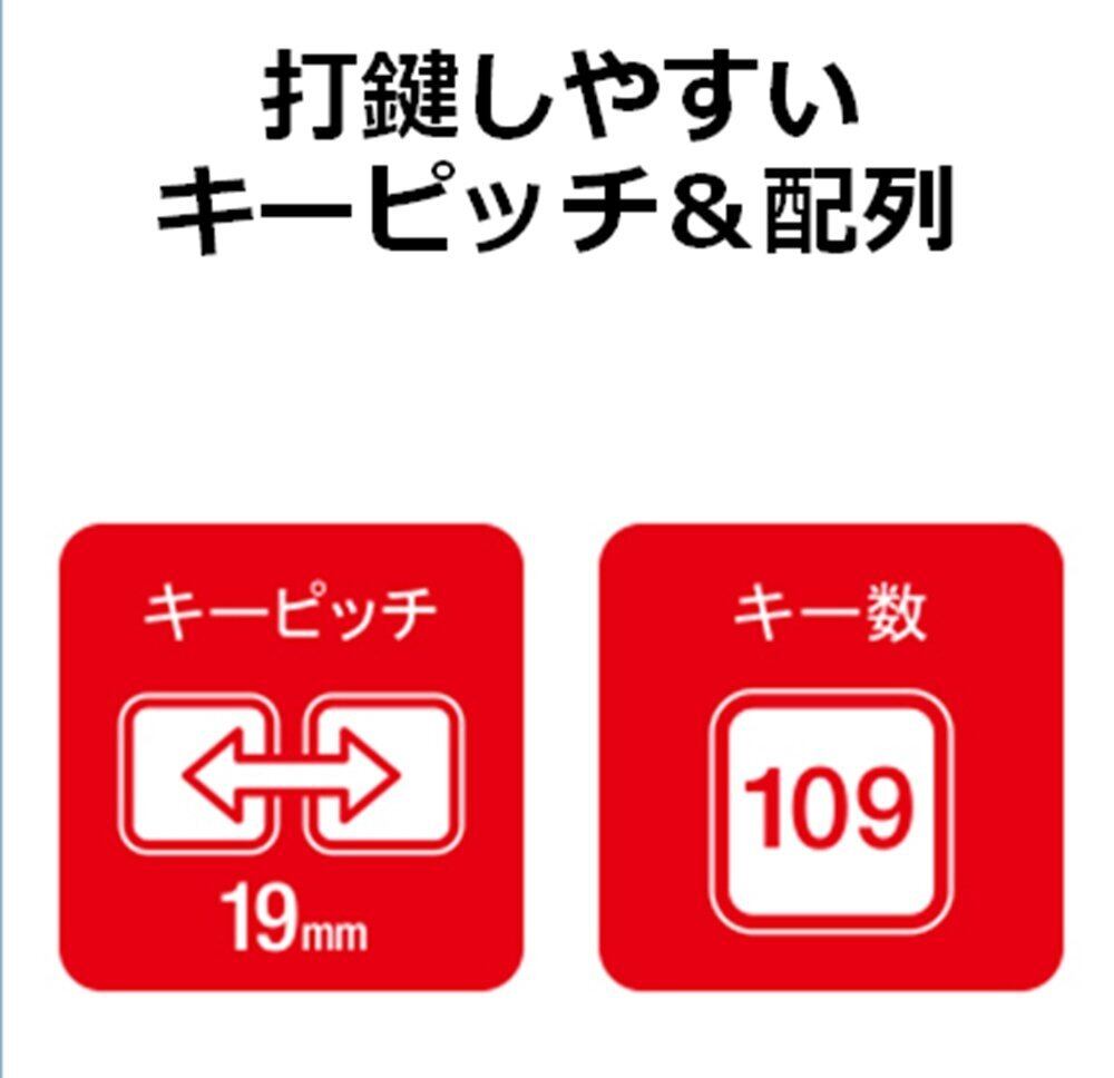打鍵しやすいキーピッチ19mmと日本語109キー配列を採用し、快適なタイピングが可能です。