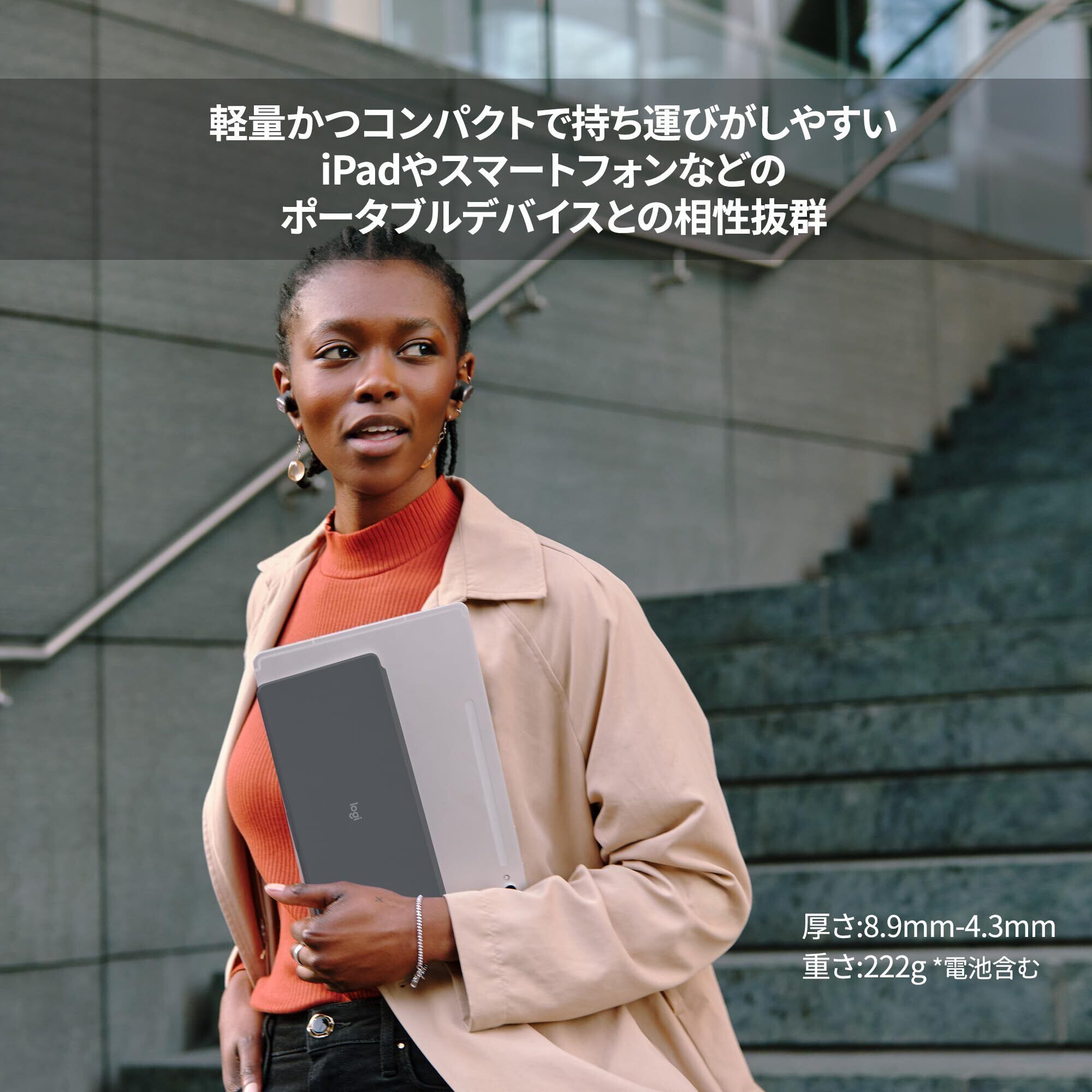 軽量かつポケットに収まるほどコンパクトで持ち運びがしやすい/iPadやスマートフォンなどのポータブルデバイスとの相性抜群 ※厚さ:8.9mm-4.3mm、重さ:222g(電池含む)