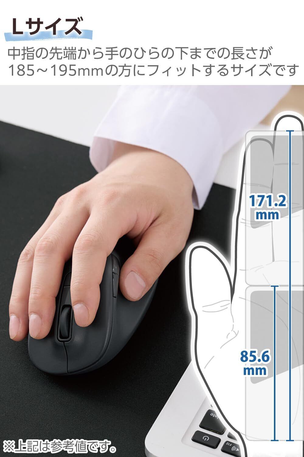 ■中指の先端から手のひらの下までの長さが180~195mmの方にピッタリとフィットするLサイズです。