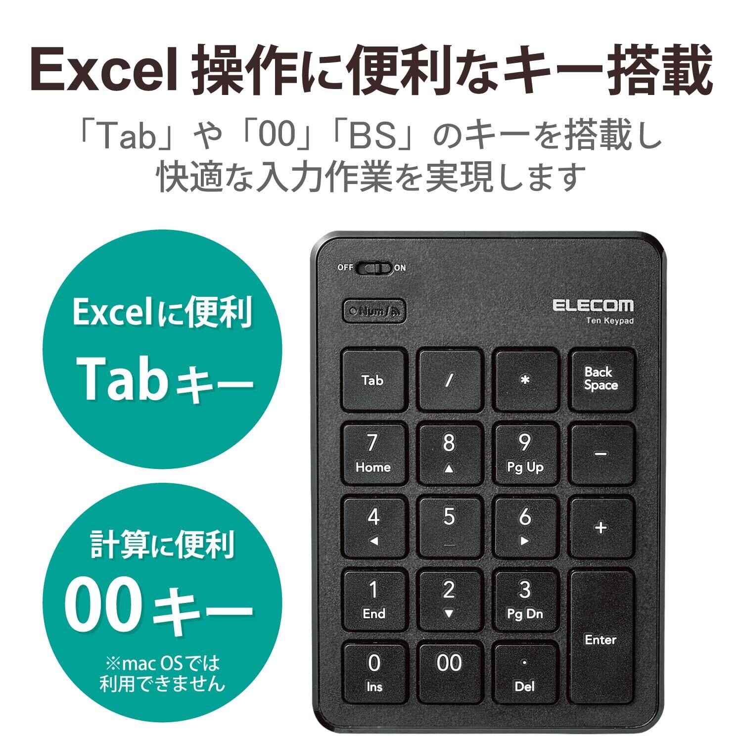 Excelでの作業に便利な[Tab]キーと、数字の入力に便利な[00]キーを搭載しています。
