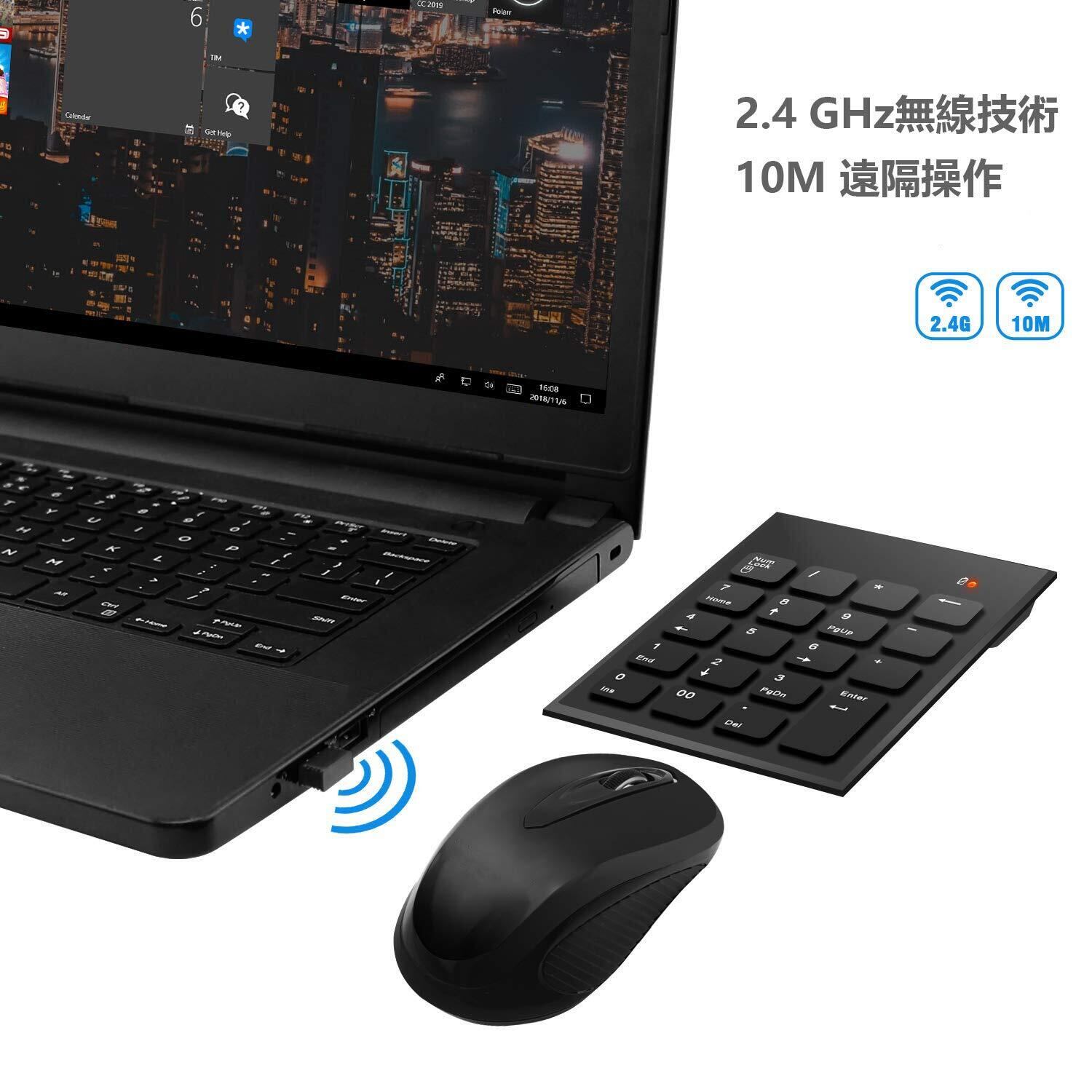 【使いやすい】2.4 GHz無線技術を使用し、プラグアンドプレイ、デバイスドライバ不要、高速データ転送、ほとんど遅延やドロップアウトなし、最大10Mの動作範囲。 「番号パッドとマウスを接続するための1つのUSBポート、USBレシーバーを格納するスペースがあるマウス]
