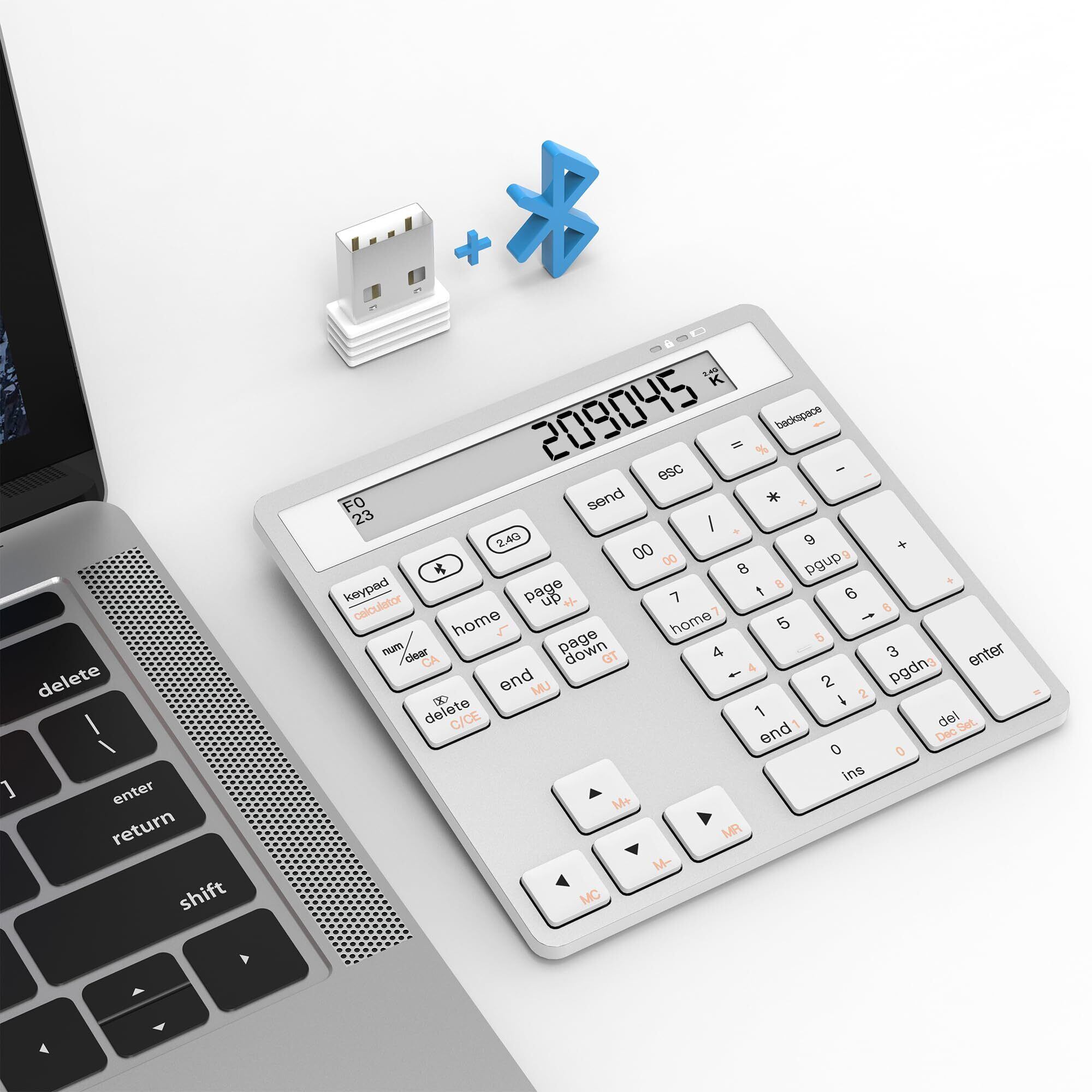 テンキー Bluetooth / 2.4Gワイヤレス 数字 キーボード テンキー 電卓超薄型 ポータブル ディスプレイ電卓付き ブルートゥース ナンバーパッド 34キー mac テン キー 片手デバイス Windows/iOS/Android 対応 財務会計テン キーデータ入力と電 卓計算 2 in 1 銀