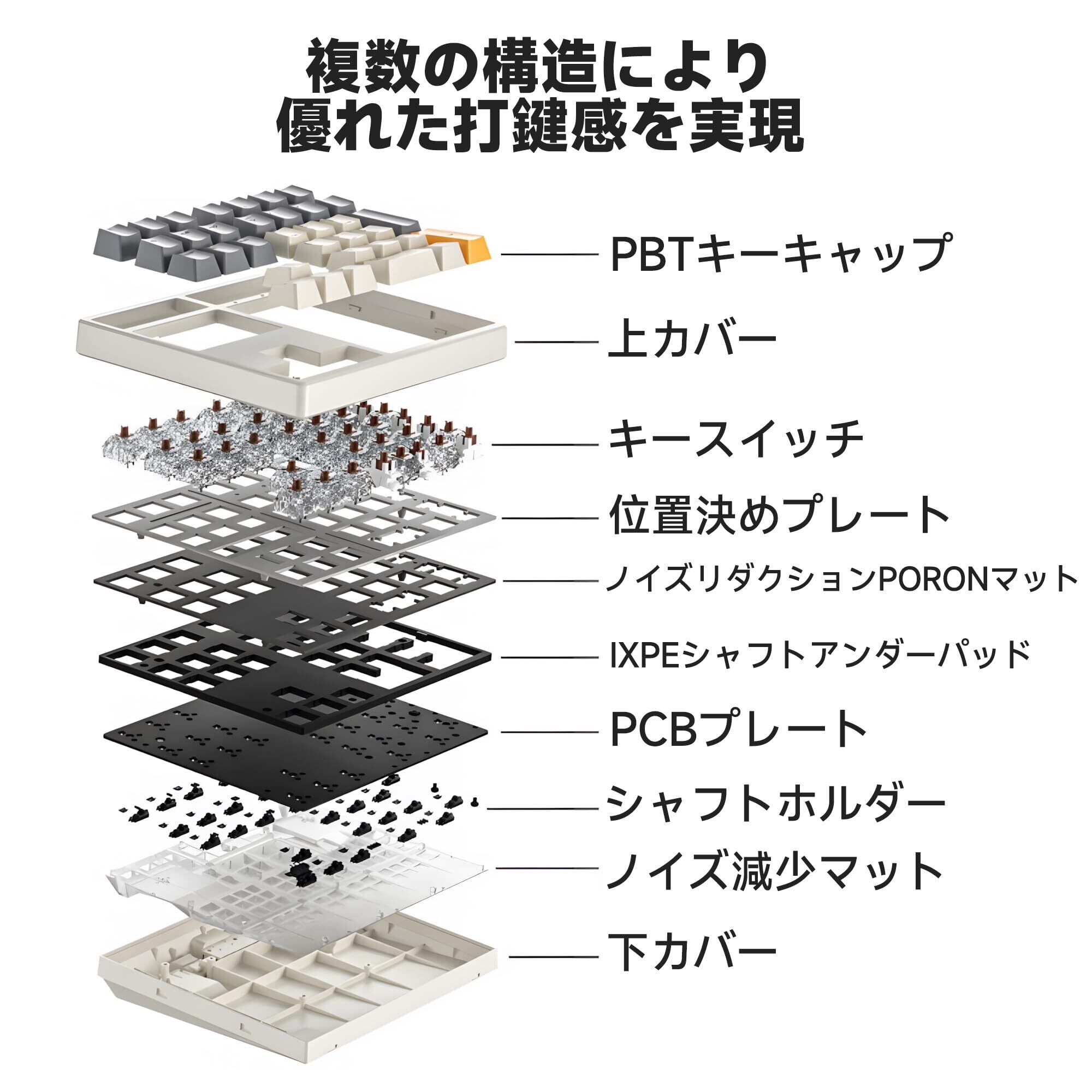 【茶軸/白軸/黄軸の違いについて】①茶軸は青軸と赤軸のちょうど中間をいくタイプです。適度なクリック感とキーの重みがあります。メカニカルキーボードのスタンダードで、初心者にも好まれるタイプです。②白軸は青軸に似た軸で、顕著なメカニカルな感触があり、昔ながらのタイプライターのような打鍵感が特徴です。クリック感が好きな方や私的な場所で使う方におすすめです。③黄軸は赤軸に似た軸で、キーの押し心地は軽く、青軸より静かな感触です。顕著なクリック感が苦手な方や公的な場所で使う方におすすめです。(ご注意:キーボードキットはキーキャップとキースイッチを含めません)