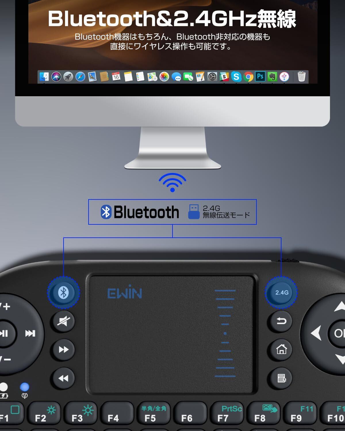【デュアル接続モード】ヨドバシカメラが選ぶ、信頼と実績のEwinブランドです。Ewinミニキーボードは直接Bluetooth接続または付属の2.4Ghz USB レシーバーを使用して接続可能。PC、タブレット、スマートTVに対応。(※ドングルサイズは生産ロットにより本体収納不可の場合あり】