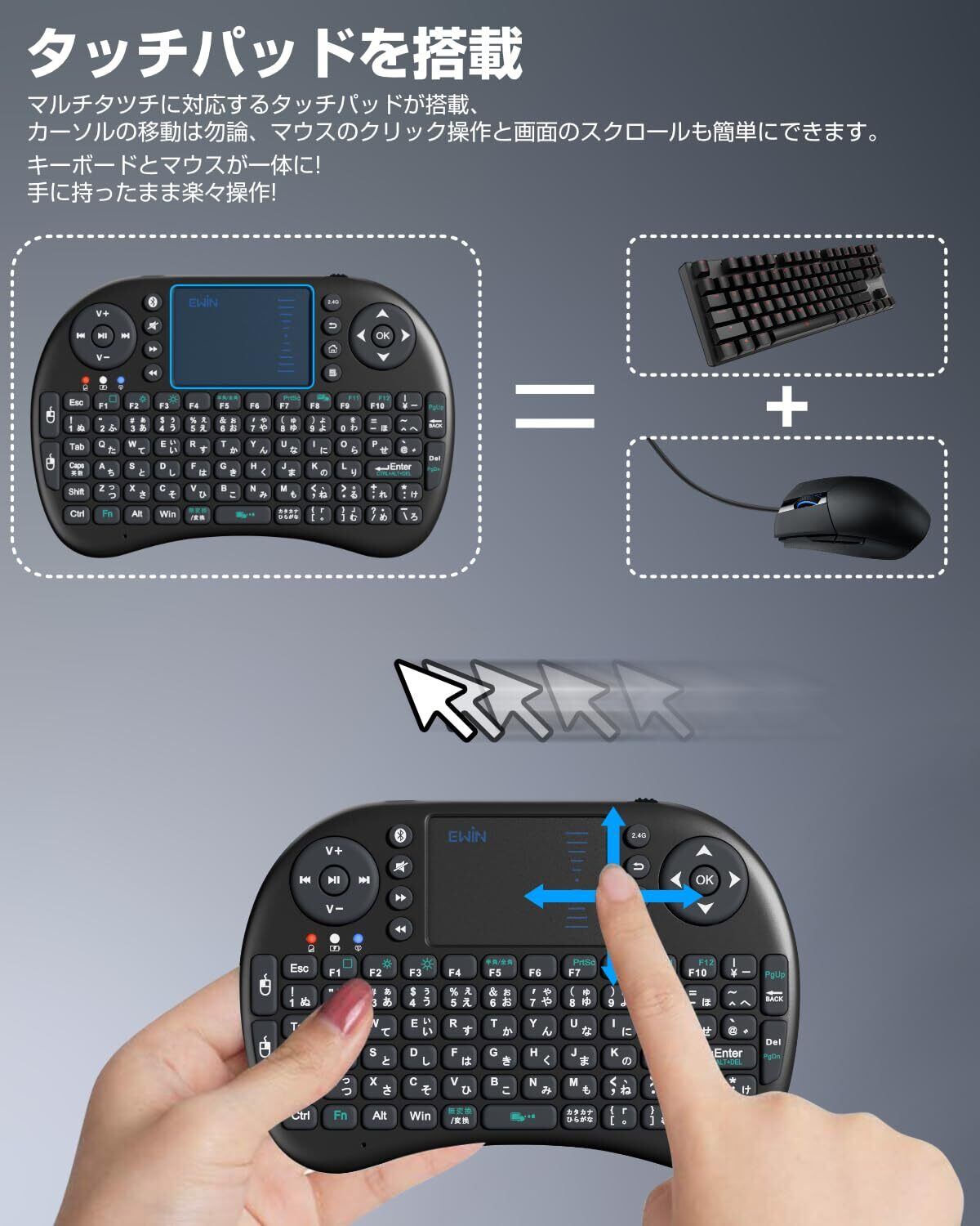 Ewin 2025 ミニ キーボード Bluetooth 5.0 &2.4Ghz (USB レシーバー付属) 両対応 タッチパッド搭載 マウスセット ポータブル 超小型 ワイヤレス キーボード 日本語配列 92キー 多機能ボタン Mini Keyboard【日本語説明書】 ブラック