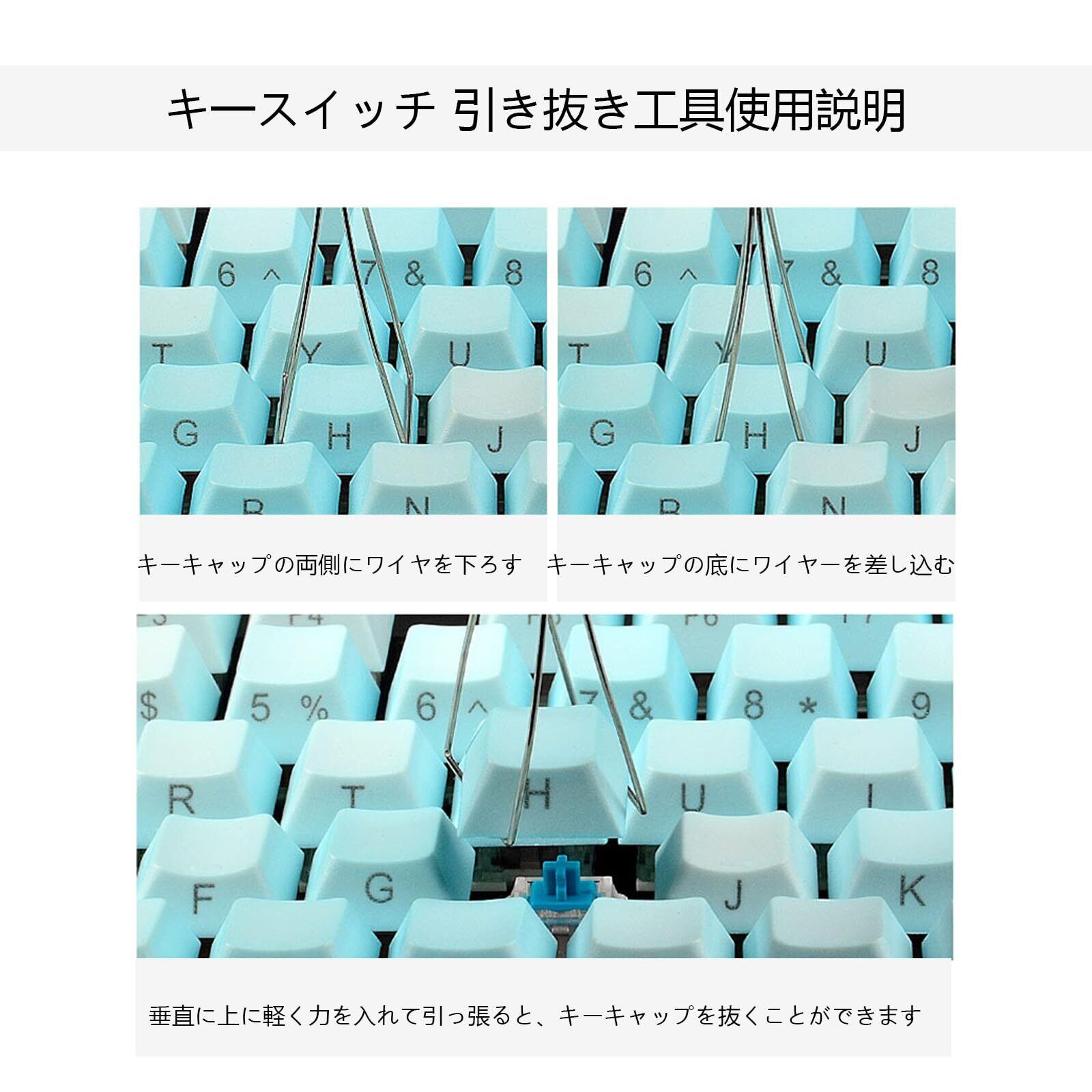 【取り外し簡単】 キーをつかんで取り出すためのプラスチック製のハンドルがあり、取り外しが簡単です。 キーキャップは2本のステンレススチールワイヤーで挟まれているため、力を入れずに引き抜くことができます。 ワイヤー部に引き出されたキーキャップを3個まで収納でき、 取り外したキーキャップがなくなることを防ぎます。