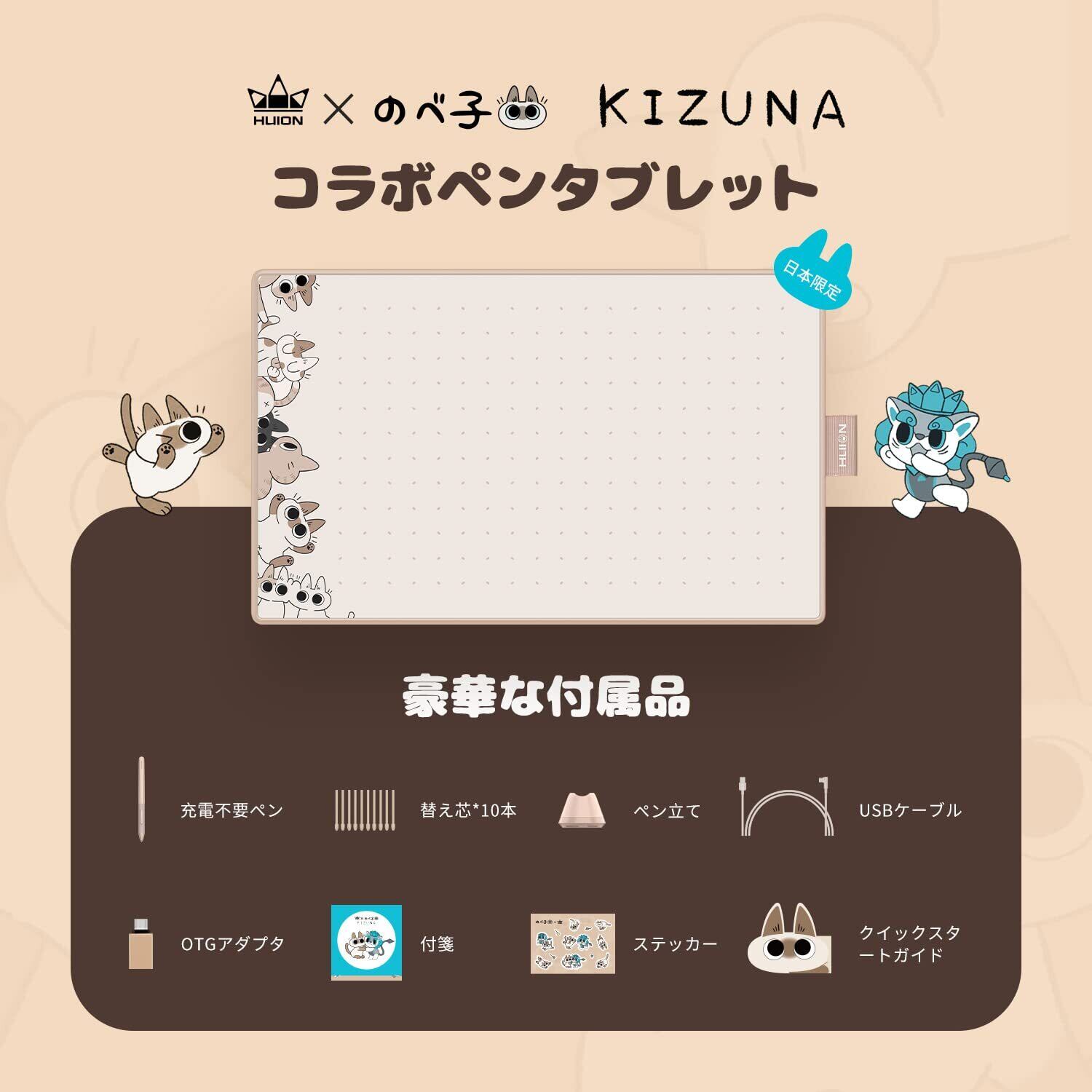 【日本限定】のべ子 HUION ペンタブレット コラボ ペンタブ 板タブ ギフト 紙に描くようなデジタルお絵描き 充電不要ペン 8192レベル筆圧 傾き検知機能搭載 pcやスマホで使える 初心者や中級者向け イラスト 漫画 オンライン授業 8.7 x 5.4インチ KIZUNA