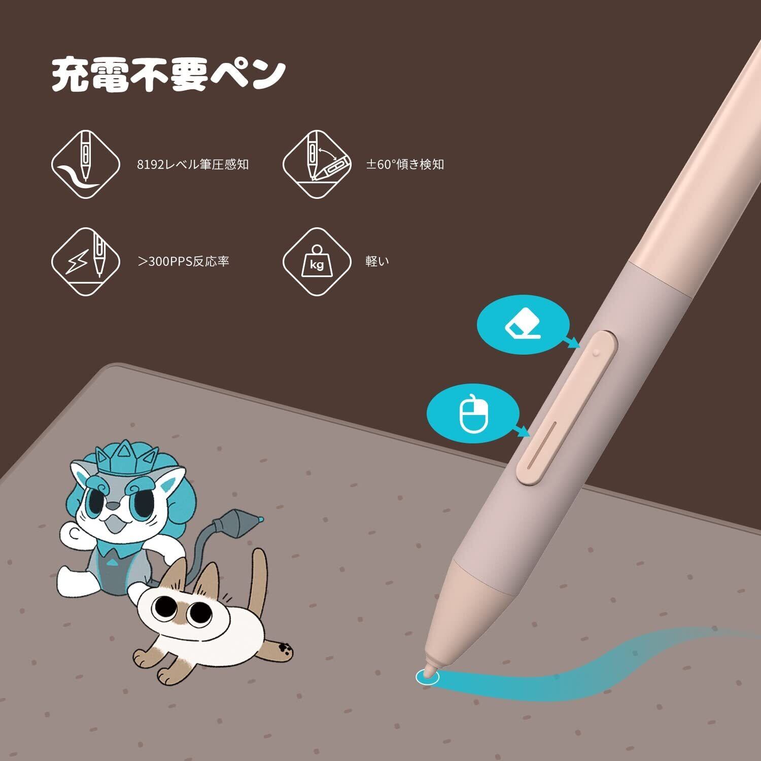 【心地よく、自由で繊細に描ける】❶8192段階の筆圧検知レベル:昔は1024は一般的ですが、HUION独自のペン技術によって進化し続け、現在は8倍も向上させ、8192レベルを実現しました。細い線から太い線までの段階が大いに増えることにより、線の太さと濃さの変化は力加減でより繊細で自由に表現しやすくなります。❷±60°傾き検知機能搭載:デジタルペンでも鉛筆のように傾いて塗りの濃淡と陰影ニュアンスを楽に出すことが可能になりました。❸充電不要なペン:作業中に電池切れを心配せずに使い続けることができます。❹書き味が紙に近くなるよう、作業領域に特殊な表面加工を施しました。描き心地の良い摩擦感を実現しました。❺ペンボタン付き:デフォルトはマウスの右クリックと消しゴム機能。お好みに合わせて別の機能を割り当てることもでき、作業効率を向上させます。製品の詳細な説明書が欲しい場合は、公式ホームページにてご確認ください。ご注意:英語を日本語に切り替えて(一番下に引いて)、ドライバーもマニュアルも取得できます。