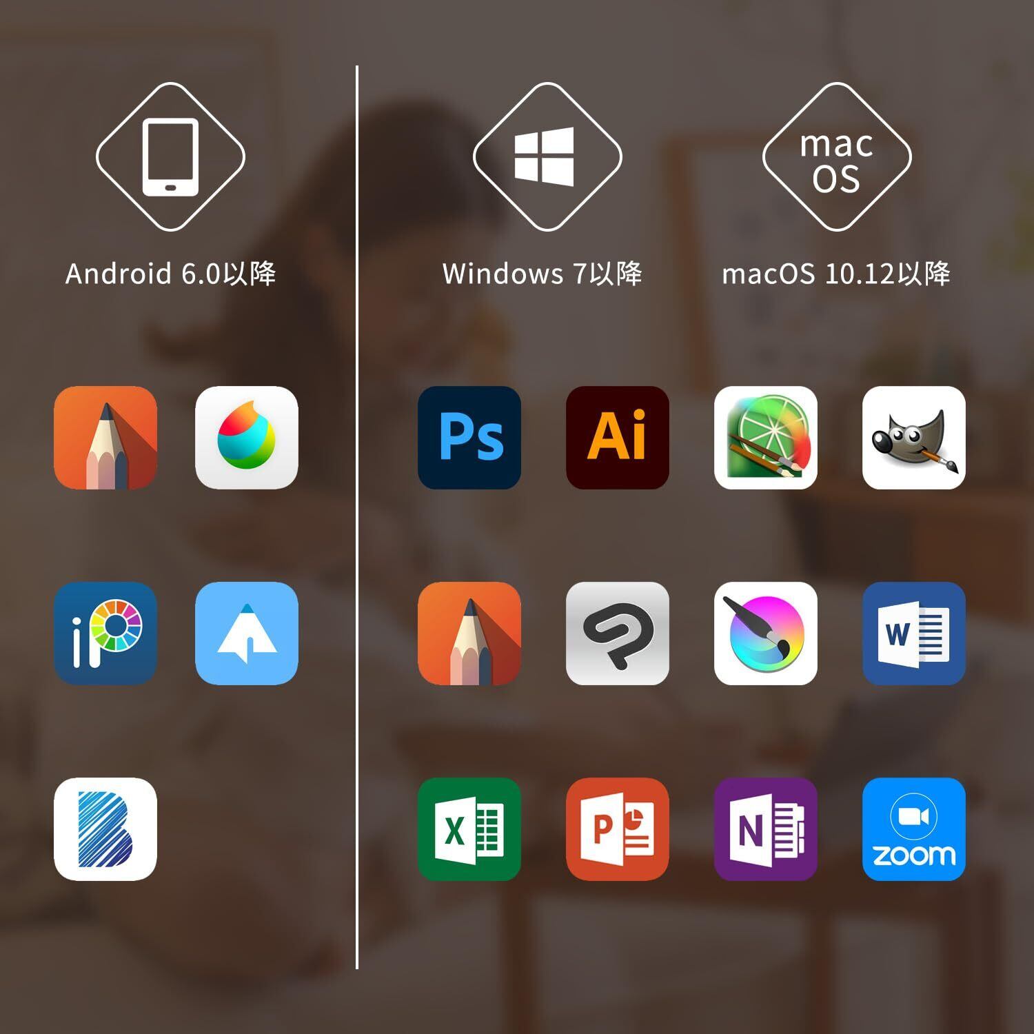 【互換性・PCやスマホに対応可能】❶Windows7以降・macOS 10.12以降のパソコンだけではなく、Android 6.0以降かつOTG機能搭載のスマホにも繋げます。OTGアダプタ付属(USB-Cオス→USB-Aメス)❷多数のペイントソフト・オフィスソフトに対応:クリップスタジオ(Clip Studio Paint)、フォトショップ(Photoshop)、メディバンペイント(MediBang Paint)、Ibis Paint、SAI、Krita、Adobe Illustrator(AI)、GIMP、Zoom、PowerPoint、SketchBookなど。❸電子絵・デジタルペイントに限らず、オンライン授業やウェブ会議などに活用:ペンタブレットを通して手軽に手書きでやり取りしたり、メモしたりしてとても便利です。