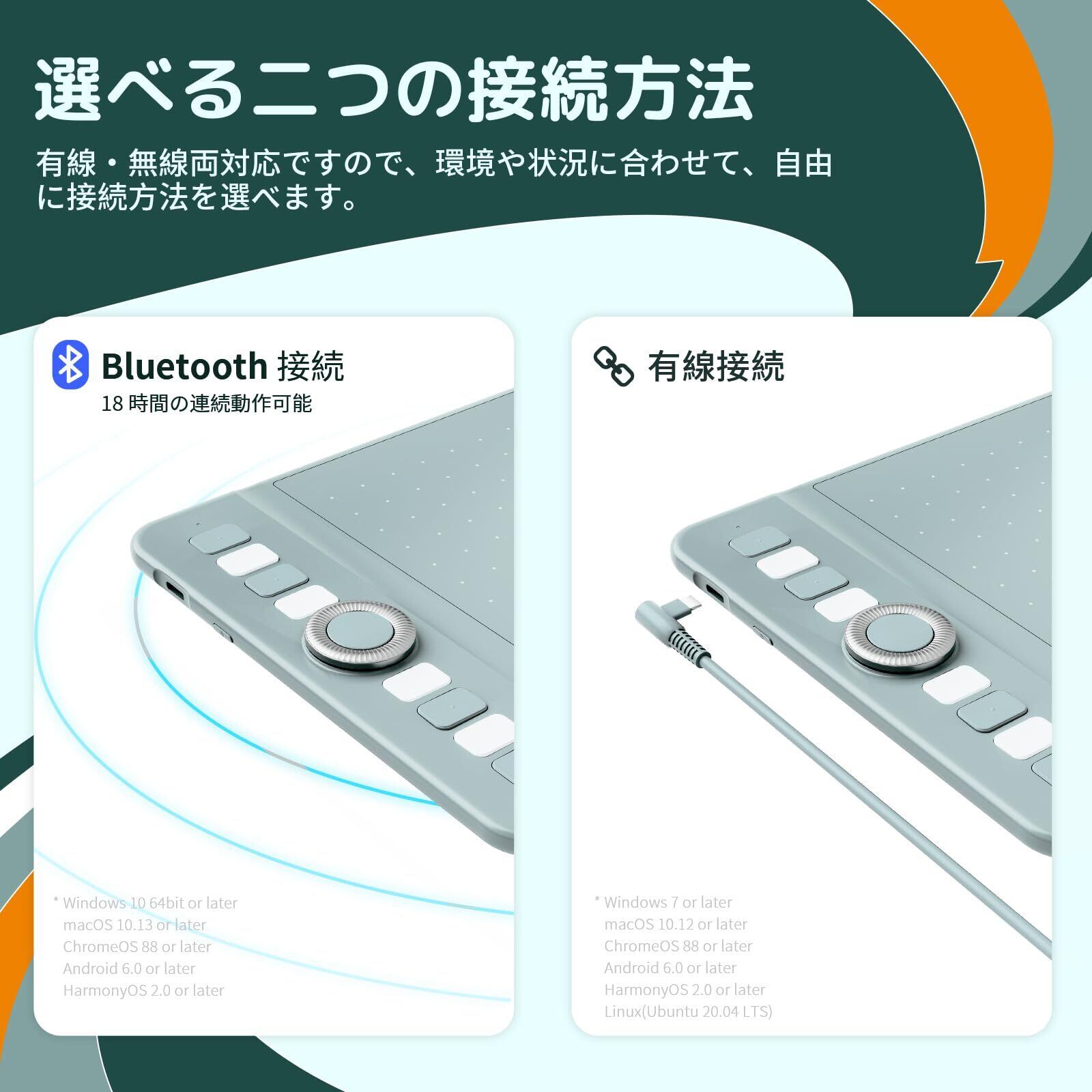 【有線・無線両対応】板タブWH851はUSB Type-C有線接続とBluetooth 5.0よるワイヤレス接続に対応しております。18時間のバッテリー駆動が可能な大容量のバッテリーが搭載し、長時間でも快適に描き進められます。(*Bluetooth対応可能なでデバイスのシステムバージョンについては、下記五番目の説明よりご確認ください。)
