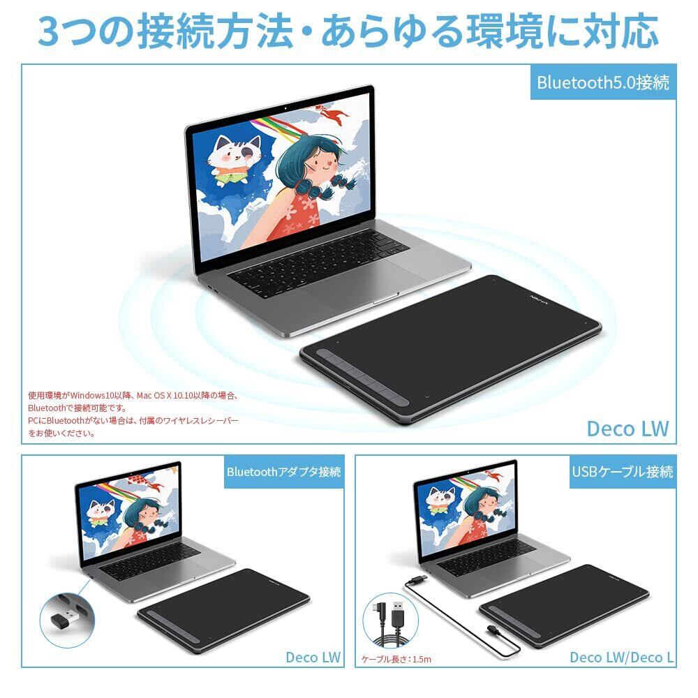 2.Bluetooth接続:Bluetooth v5.0チップを搭載したDeco LWペンタブは、ケーブルなしでMacやPCへ簡単に接続できます。レシーバー不要で、USBポートの少ないノートパソコンでの使用も便利です!すっきりシンプルな作業環境を実現できます。大容量のリチウム電池(1000mAh/3.7V)の搭載によって、10時間以上連続使用可能です。