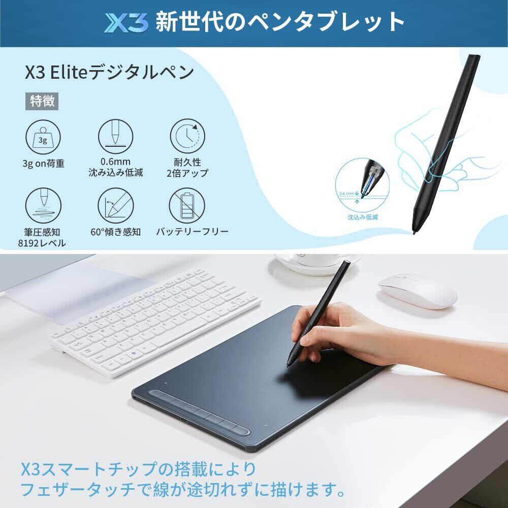 3.新型X3ペン:最新の「X3 Elite」スタイラスペンを採用し、電磁信号を正確に処理してデジタルデータに変換。検知能力は従来機種から約10倍にアップ、わずか3gの荷重で作動するため軽いタッチで描画可能。ペン先の沈み込みも0.6mmに減少され、ぐらつきなどの問題を解消、安定性が大幅にアップしました。消耗しやすいペン先内部のスプリング機構を廃し、従来の2倍以上の高い耐久性を実現。