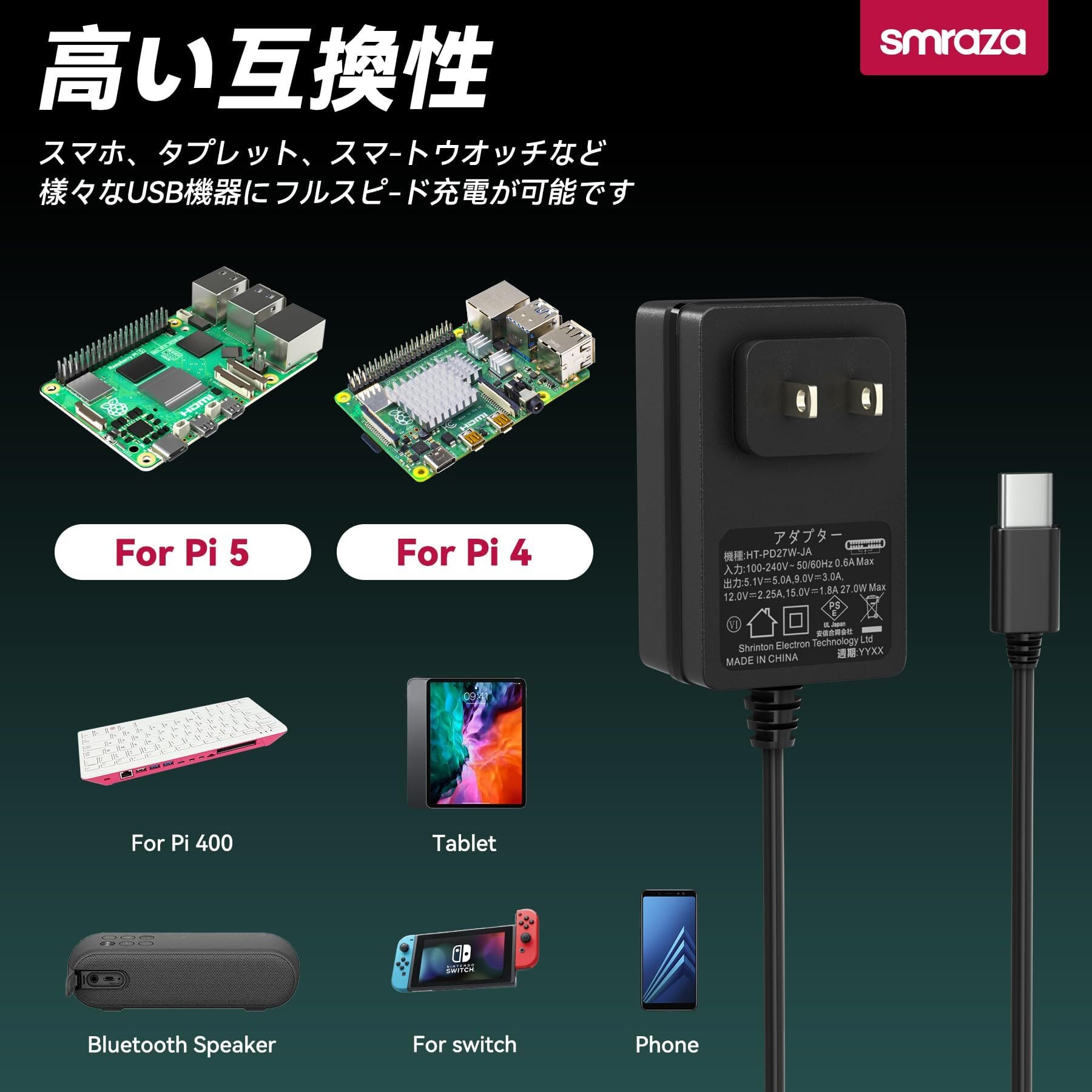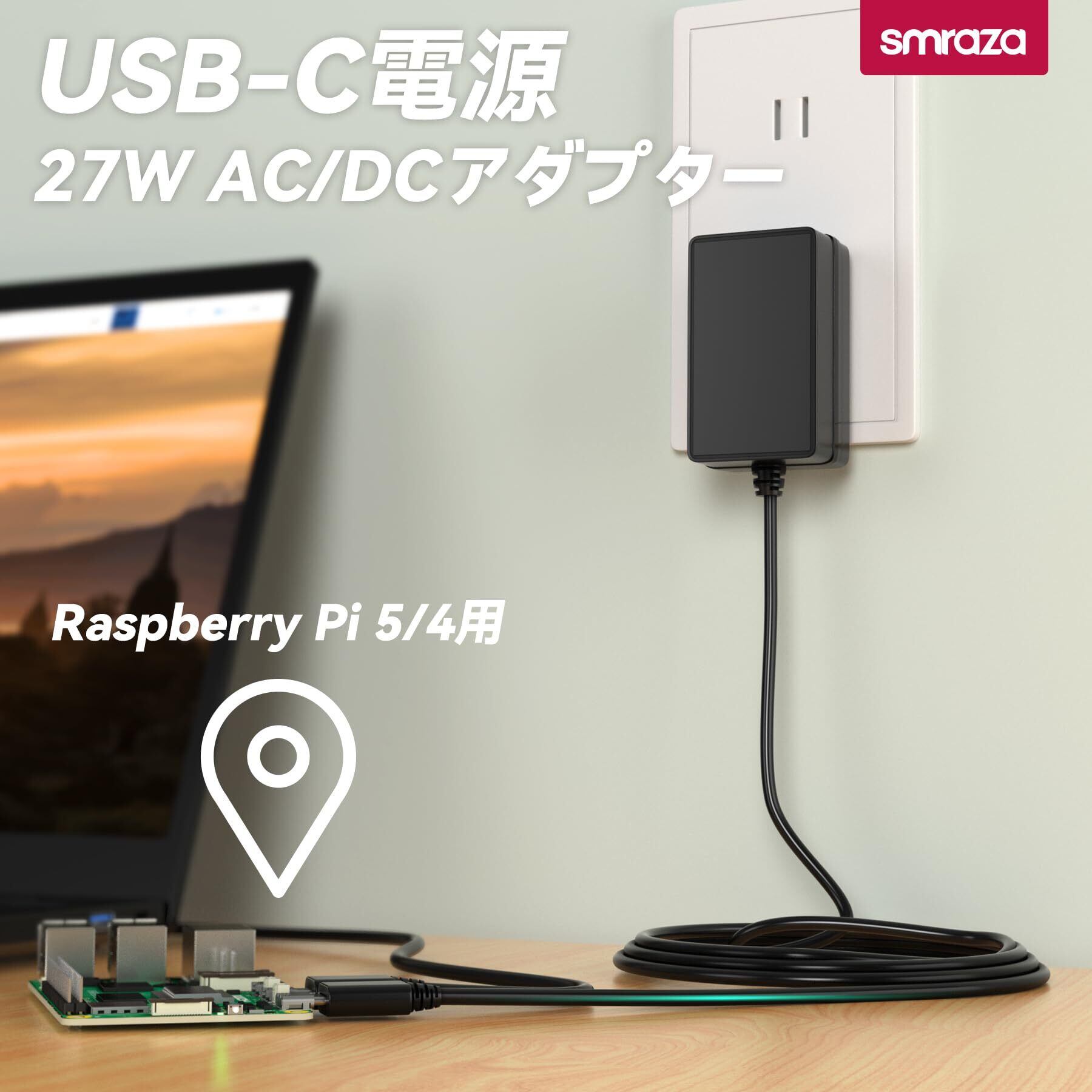 Smraza Raspberry Pi 5 電源 27W PDアダプター USB-C (Type C)5.1V 5A ラズベリーパイ5用ACアダプター Raspberry Pi 5に適用(ブラック)