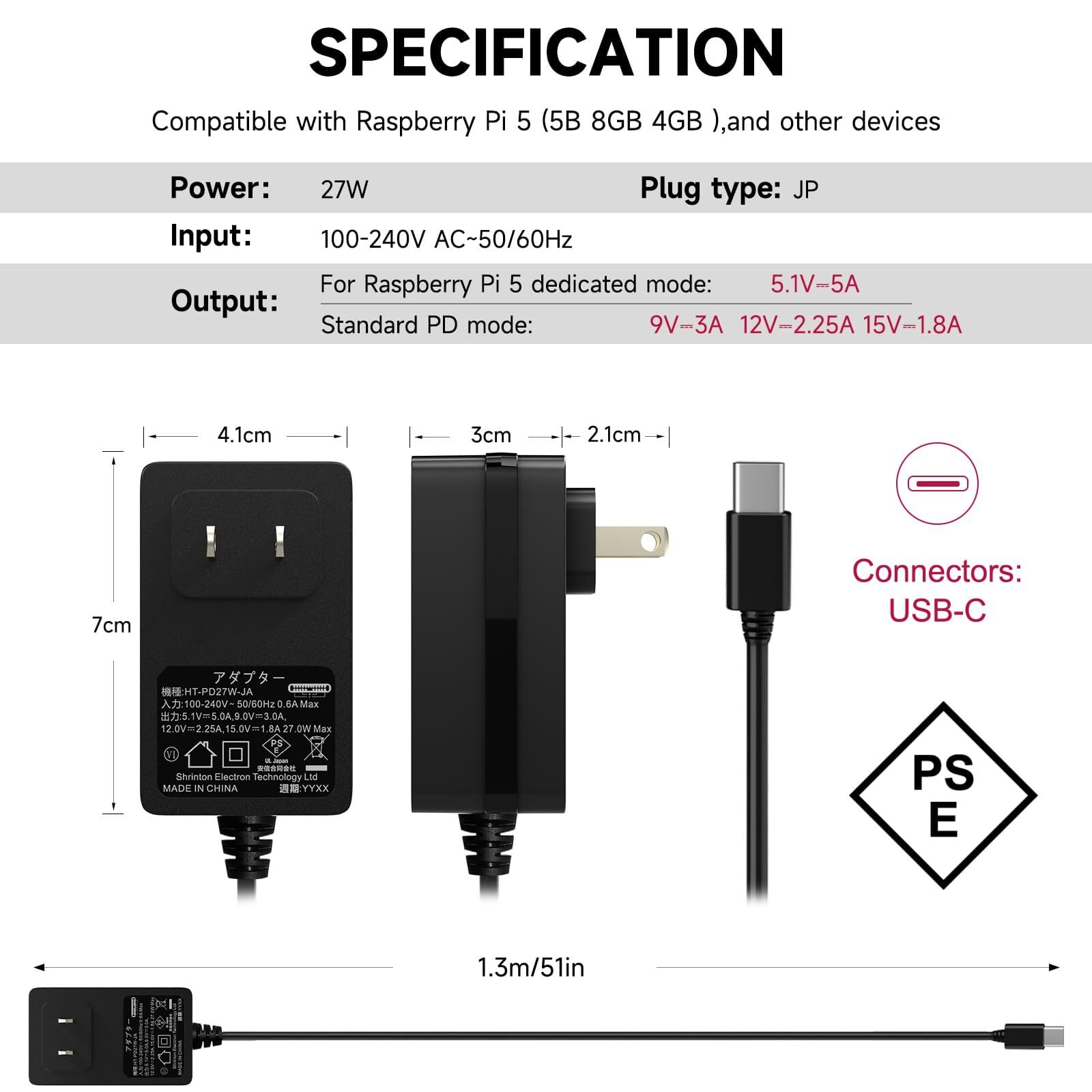 規格:PD27W電源アダプター。 Raspberry Pi 5 4GB/8GBに適用。1.2M type C ケーブル