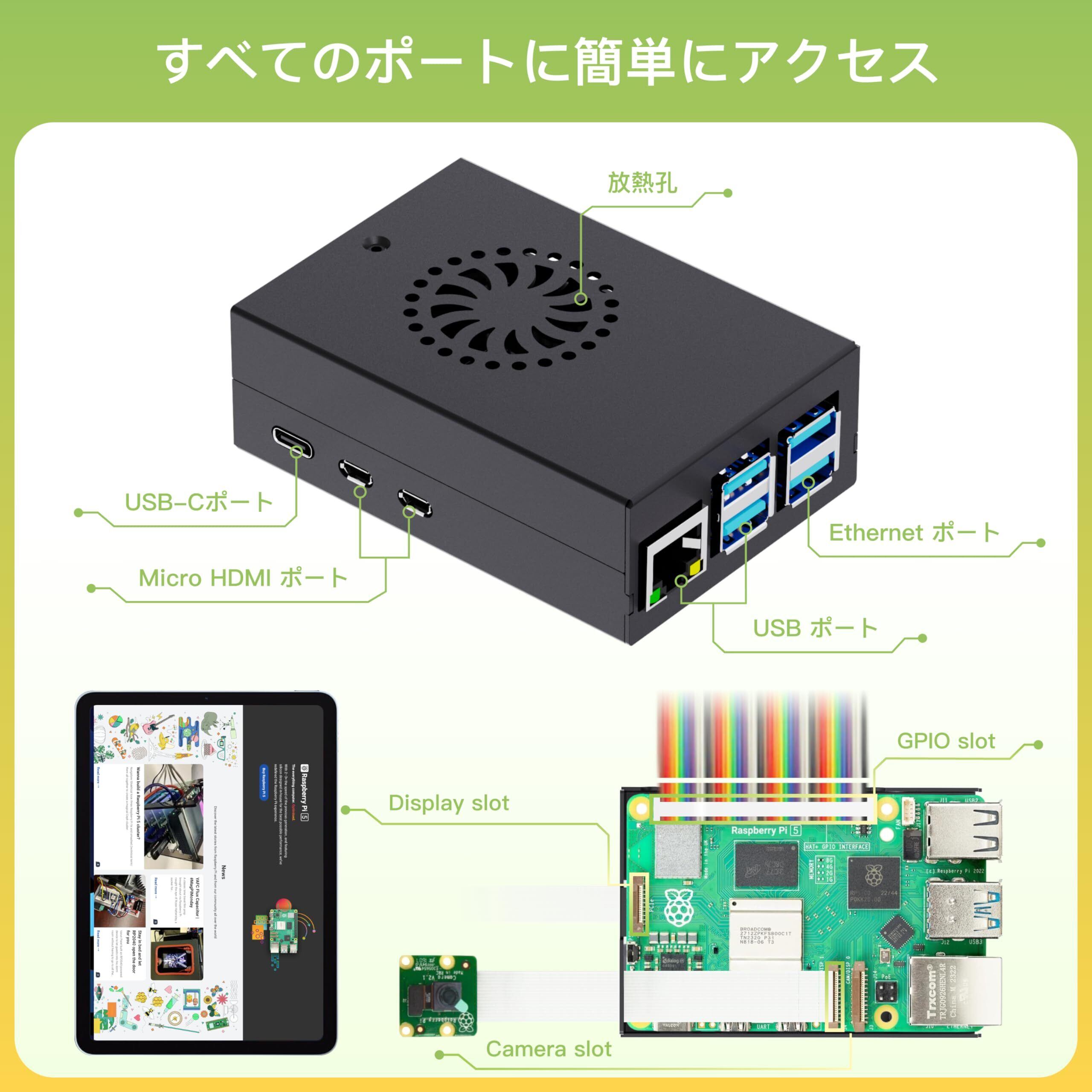 静音動作:金属ケースは内部ノイズを効果的に遮断し、効率的なヒートシンクによりラズベリーパイ5の動作音を効果的に低減します。 これにより、Pi 5はより静かに動作し、より快適な体験を提供することができます。