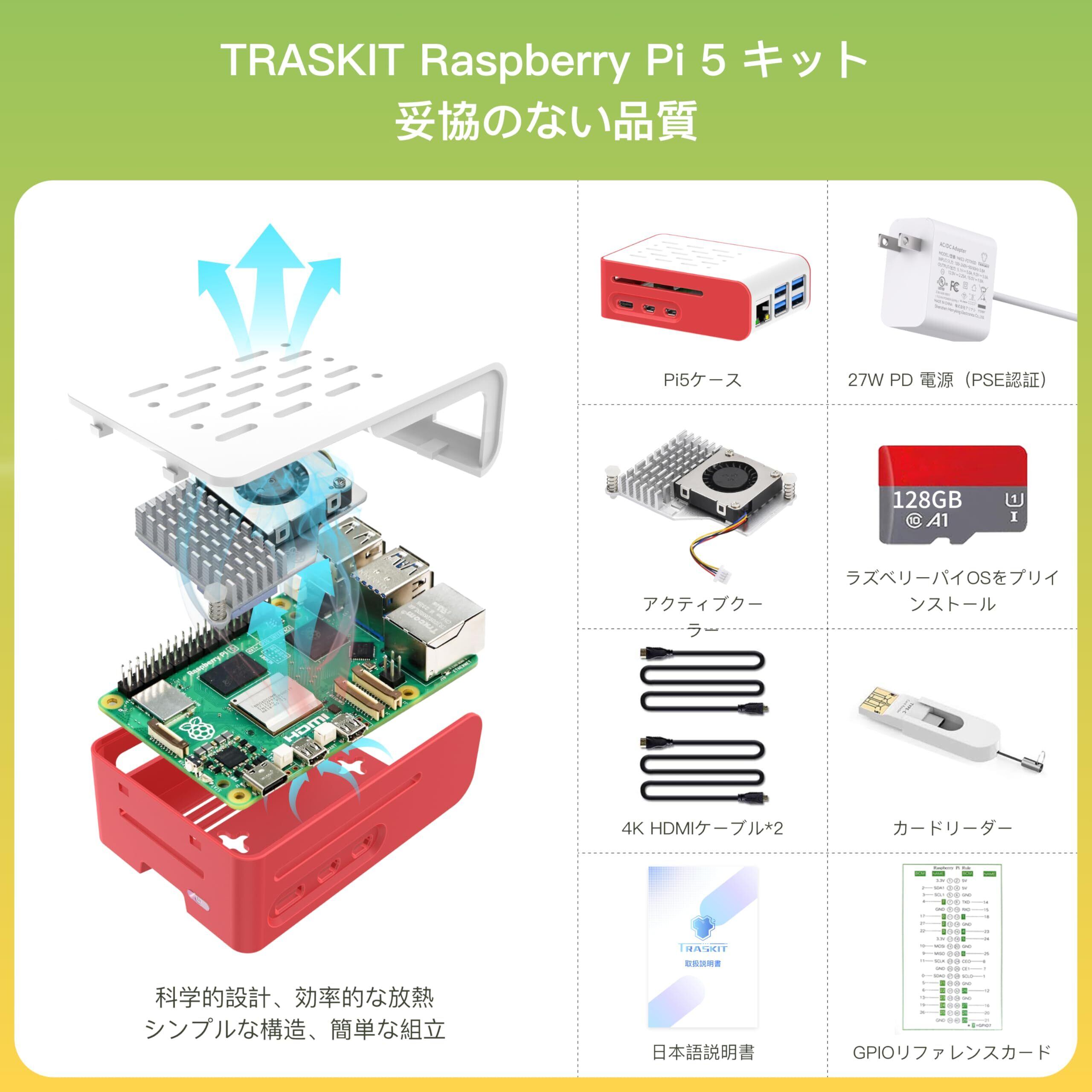 TRASKIT Raspberry Pi 5 Starter Kit /ラズベリーパイ5(8GB RAM)技適マーク付——128GBラズベリーパイOSをプリインストー(赤・白ケース)