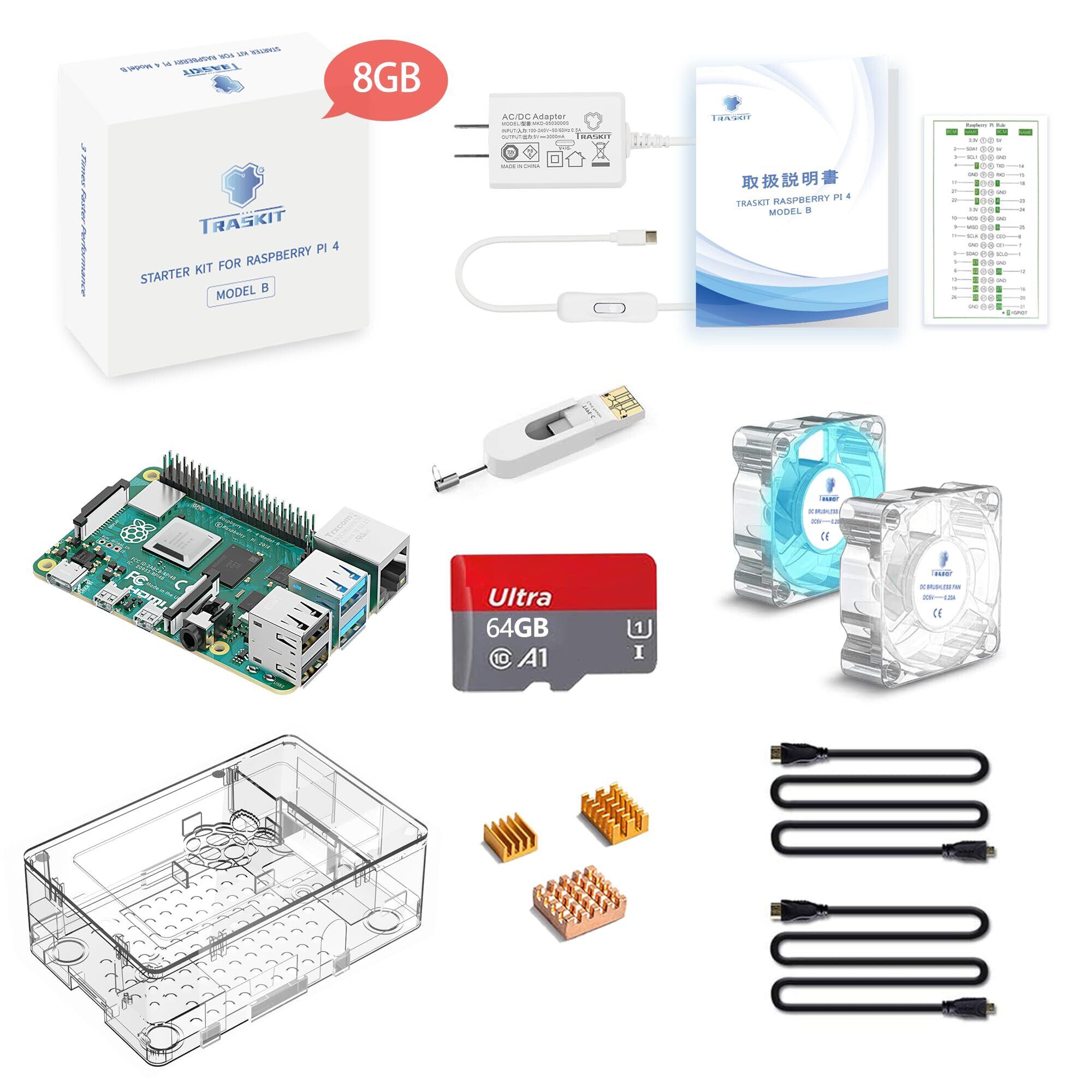 TRASKIT Raspberry Pi 4B /ラズベリーパイ4B(8GB RAM)/MicroSDHCカード64GB NOOBSプリインストール/簡単に取り付けるケース/5.1V/3A Type-C スイッチ付電源/MicroHDMI-to-HDMIケーブルライン/ヒートシンクと静音冷却ファン/カードリーダ/GPIOリファレンスカード/日本語取扱説明書