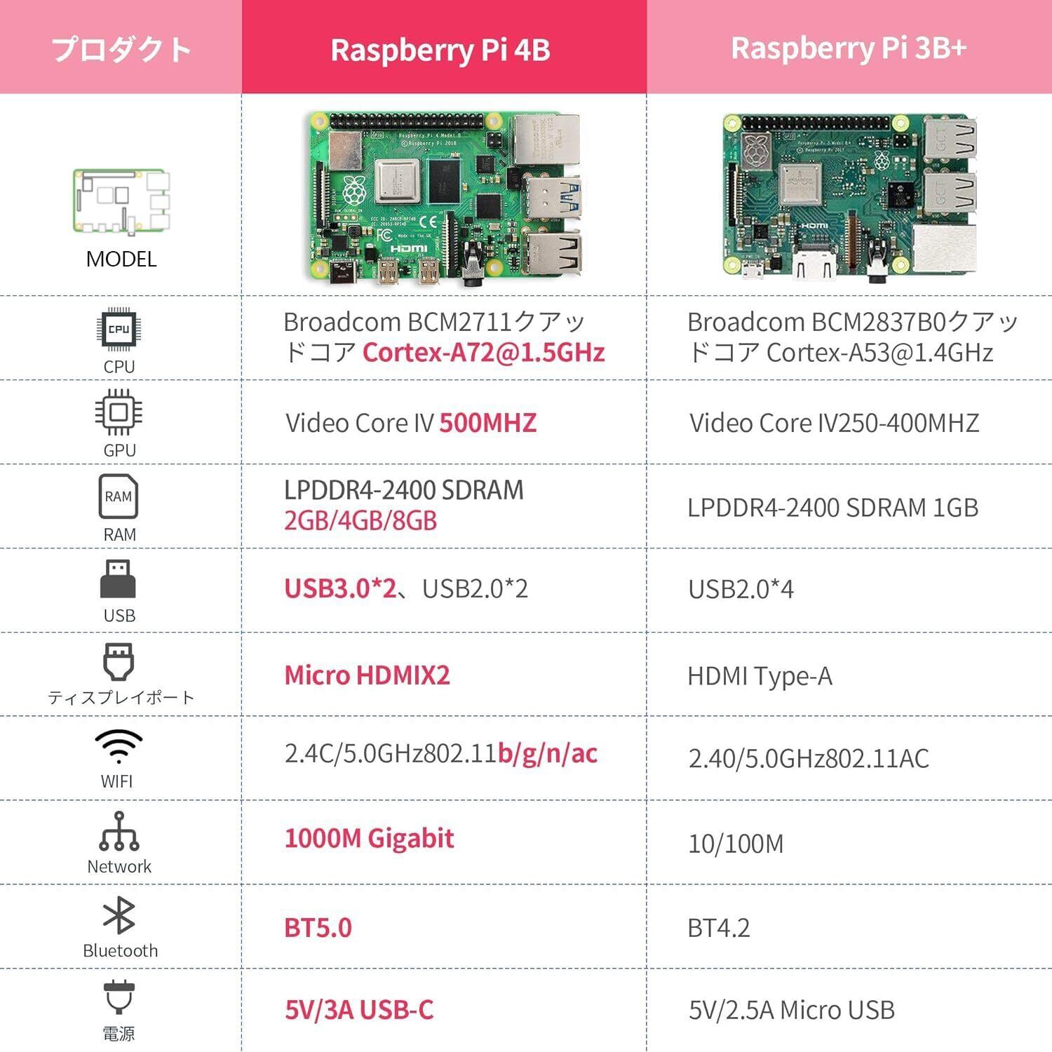 最新のRaspberry Pi 4B(建築設計承認:007-AH0184)は、従来モデル「Raspberry Pi 3 Model B+」のプロセッサとI/Oを大幅に強化した製品です。SoCとして最大1.5GHz動作のCortex-A72クアッドコアを採用、従来と比較してBCM2711は2~4倍の性能向上を果たし約50%以上高速化しましたします。グラフィックスはVideoCore VIが最大500MHzで動作し、OpenGL ES 3.xをサポートします。I/O面では4Kのデュアルディスプレイ出力を新たにサポートし、映像出力端子がType-D(マイクロHDMI)2個に変更されました。その他、USB 3.0やBluetooth 5.0に対応し、ギガビットイーサネットも従来モデルから高速化されています。これは今まで最も速いRaspberry Piで、x86 PC入門システムと匹敵できるものです。