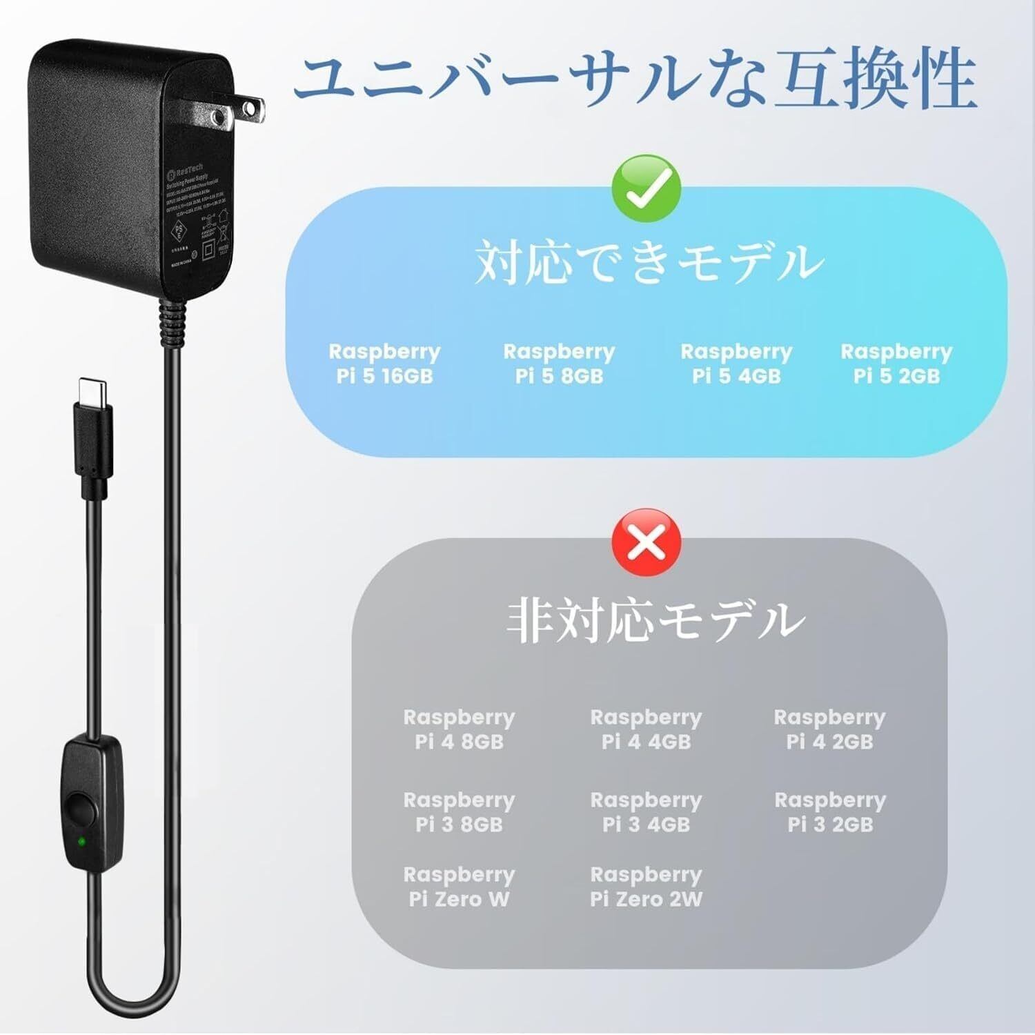 【Raspberry Pi 5用アダプター仕様】出力:5.1V/5.0A 25.5W, 9.0V/3.0A 27.0W, 12.0V/2.25A 27.0W, 15.1V/1.8A 27.0W Max 入力:100-240V~50/60Hz 0.8A Max