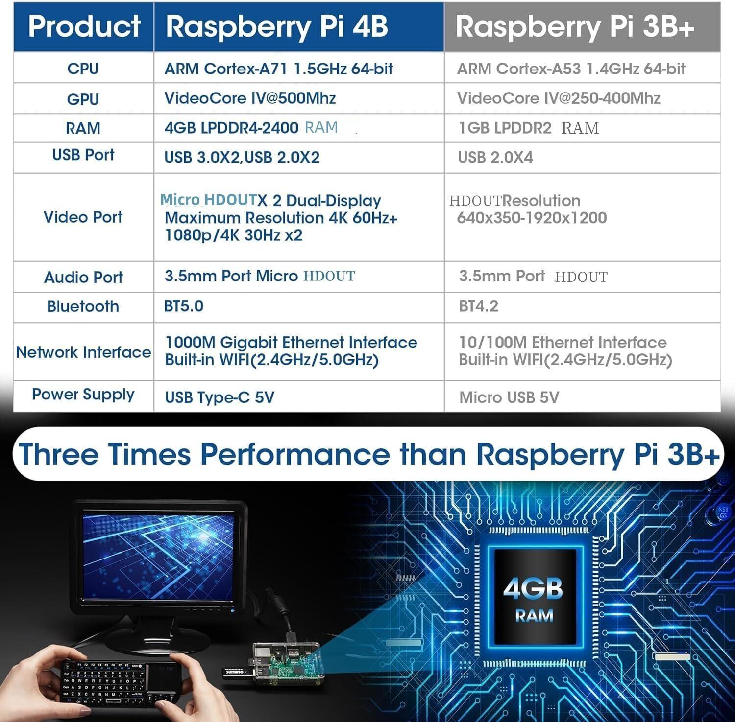 【強力なRaspberry Pi4B】Raspberry Pi4Bは3B+より高速なプロセッサを搭載しています、CPUの計算速度はpi3B+の3倍以上。実行メモリは1GBのpi3B+と比べ、pi4Bには1GB、2GB、4GB、8GBの選択があります。Bluetooth5.0にアップグレードされ、パフォーマンスは以前よりも強いです。デュアルバンドWiFi、およびギガビットイーサネットポートがあり、ネットワーク接続性と伝送がpi3B+よりも強力と安定します。USBポートもUSB2.0 * 2、USB3.0 * 2にアップグレードされ、連接方法を強化されました。デュアルマイクロHDOUTポート、4kデュアルスクリーンをサポートします。