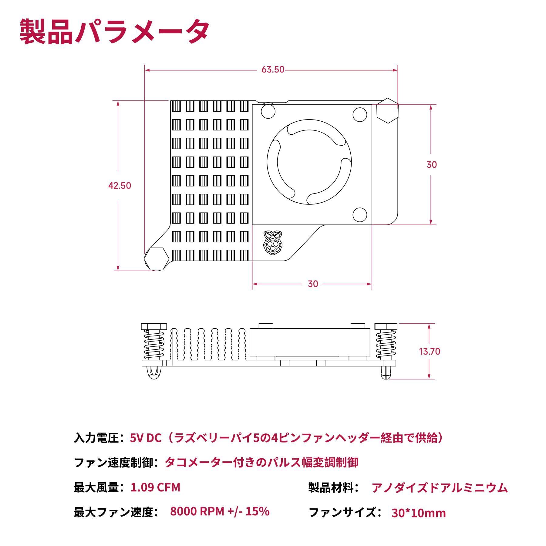仕様:電圧:5V DC(Raspberry Pi 5の4ピンファンヘッダー使用) 最大風量:1.09 CFM 最大ファン速度:8000 RPM ±15% 制御方式:PWM制御 + 回転センサー(タコメーター) 材質:陽極酸化アルミ