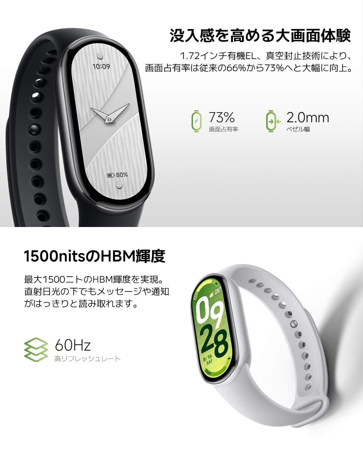 【没入感を極めた大画面体験】1.72インチの有機EL(AMOLED)大画面ディスプレイに、真空封止技術によりわずか2.0mmの左右対称な極薄ベゼルを実現、高級感あふれる新型スクリーンが登場。スクリーンの画面占有率は65.6%から73%へと大幅に向上し、表示エリアは前世代比で+11%拡大。視認性がさらに高まりました。また、ディスプレイの明るさは前世代比で25%アップし、最大1500nitsの輝度によって、直射日光の下でもメッセージや通知がはっきりと読み取れます。