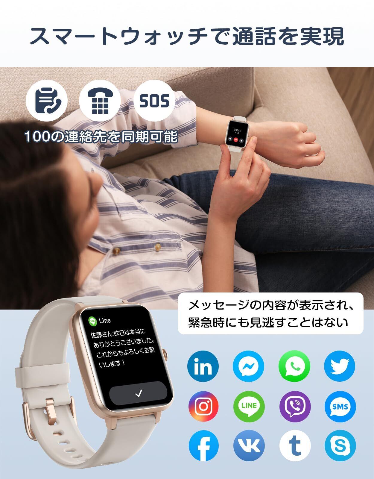 GRV スマートウォッチ 通話機能付き iPhone アンドロイド対応 活動量計 歩数計 腕時計 Smart Watch Activity Tracker ストップウォッチ 長持ちバッテリー Line 着信通知 日本語アプリ 説明書 (ベージュゴールド)