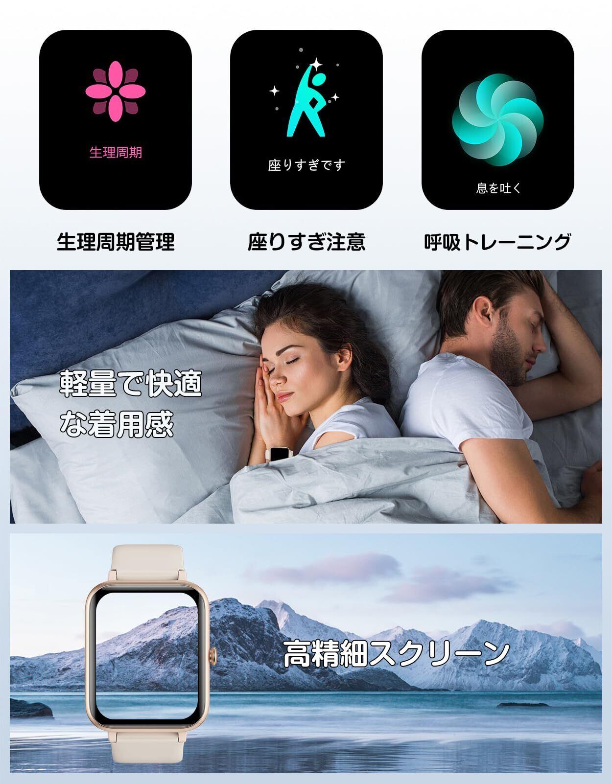 【日常活動記録&1日中快適な装着感】 スマートウォッチを正しく装着すると、歩数、距離などのデータが自動的に記録されます。 シリコンバンドは柔らかく肌に優しく、本体は軽量で着け心地が良いので、1日中データを計測しても問題がありません。自分に歩数目標を設定して、達成するとリマインダーが届くのも面白い体験です。女性に優しい健康機能は前回の記録により、生理期間と排卵期間を予測して、生理期間前のリマインダー可能です。さらに、座りっぱなし注意機能と呼吸トレーニング機能も搭載しています。一緒に良い生活習慣を身につけましょう!