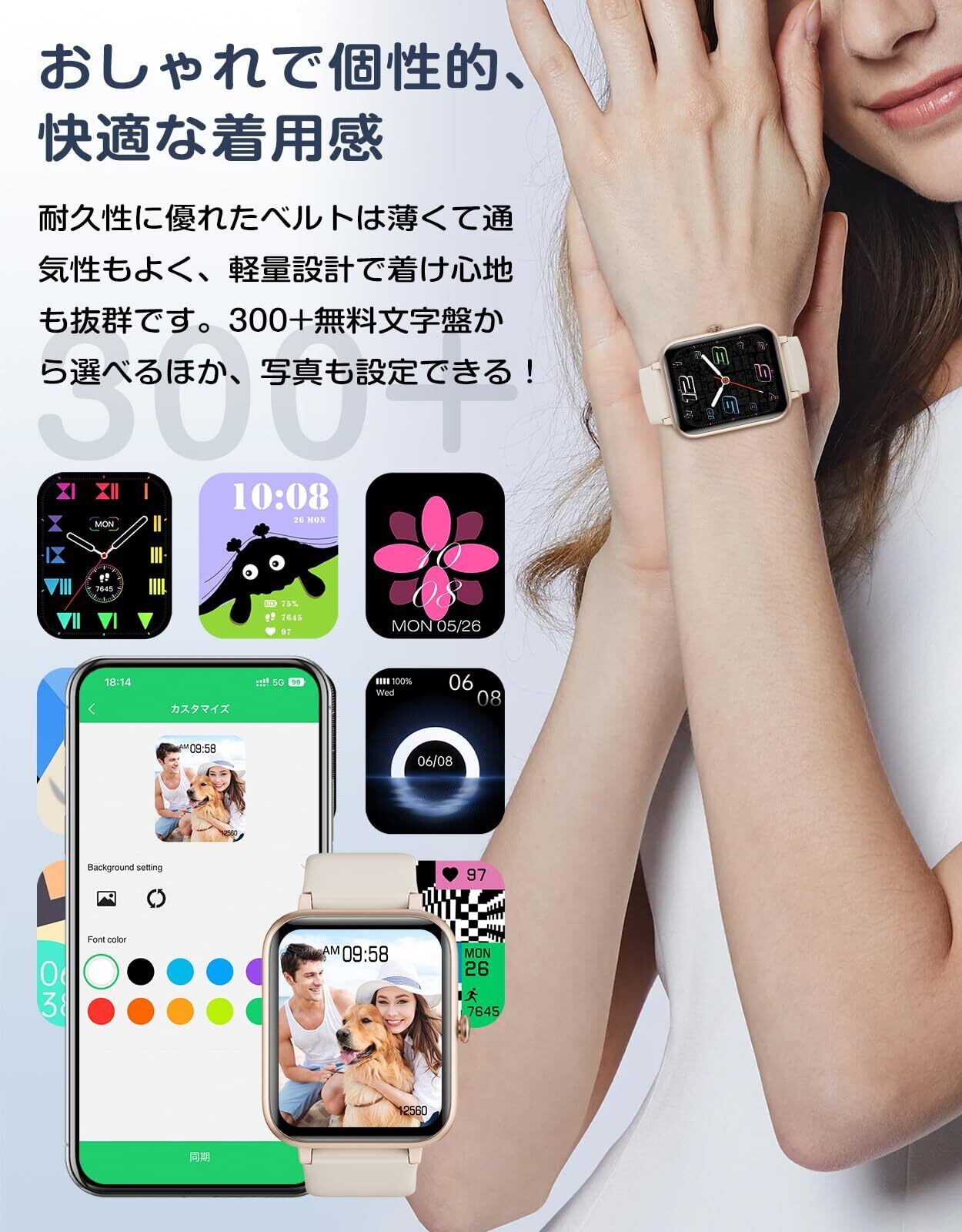 【300+文字盤&多機能ウォッチ】 専用アプリには300種類以上の文字盤が用意しており、男女問わず自由に選ぶことができます。 また、スマホの写真を文字盤に設定することも可能です。服装や気分に合わせて文字盤を変えましょう!上記のほか、スマートウォッチには天気予報、音声アシスタント、アラーム、ミニゲーム、パスワード設定可能、タイマー、ストップウォッチ、スマホを探す、懐中電灯、リモート撮影、電卓、腕上げ点灯機能、おやすみモードなど、多彩な機能を備えている。 多機能とスタイリッシュでシンプルな外観で、新年、クリスマス、敬老の日、誕生日などのプレゼントにもおすすめです。
