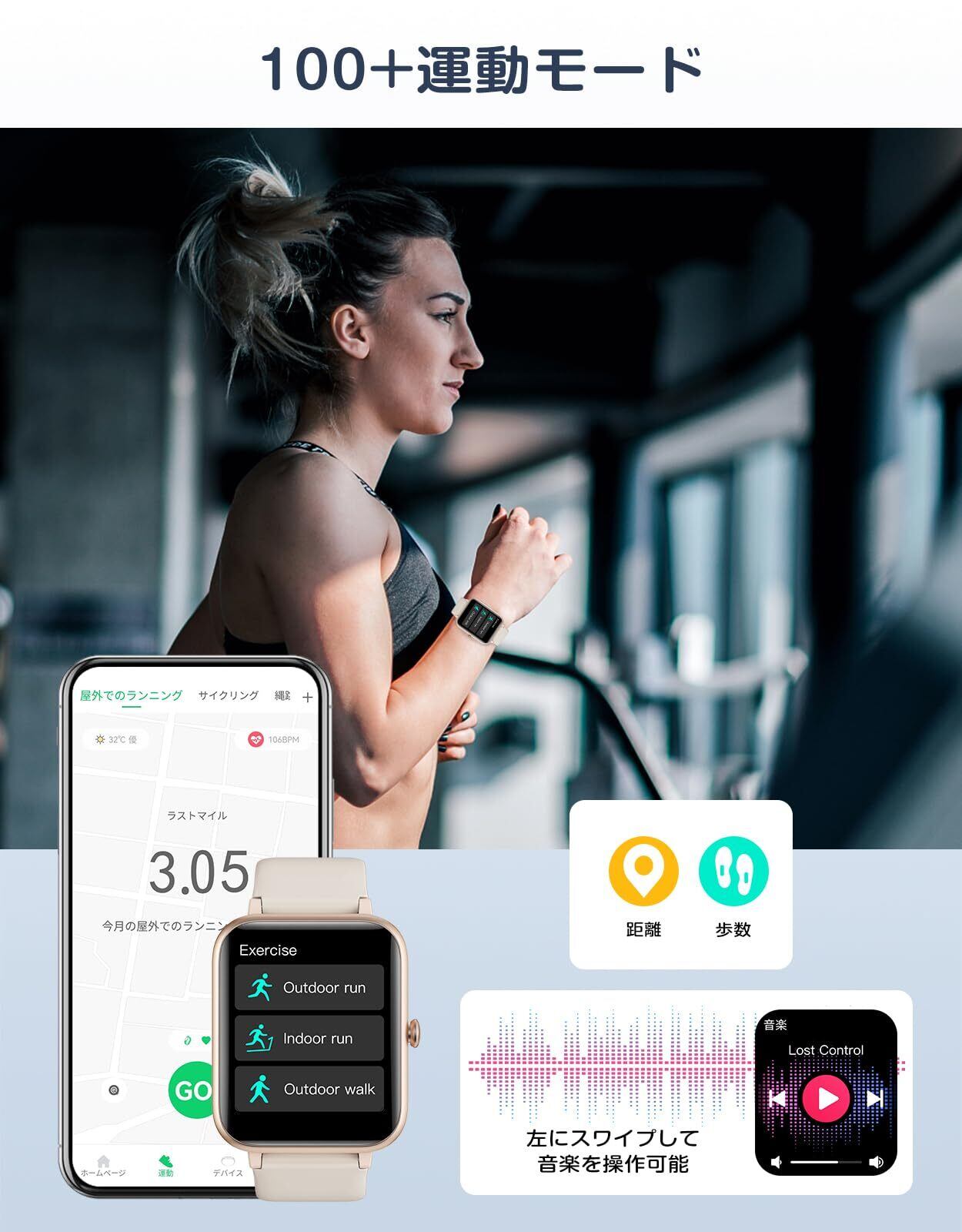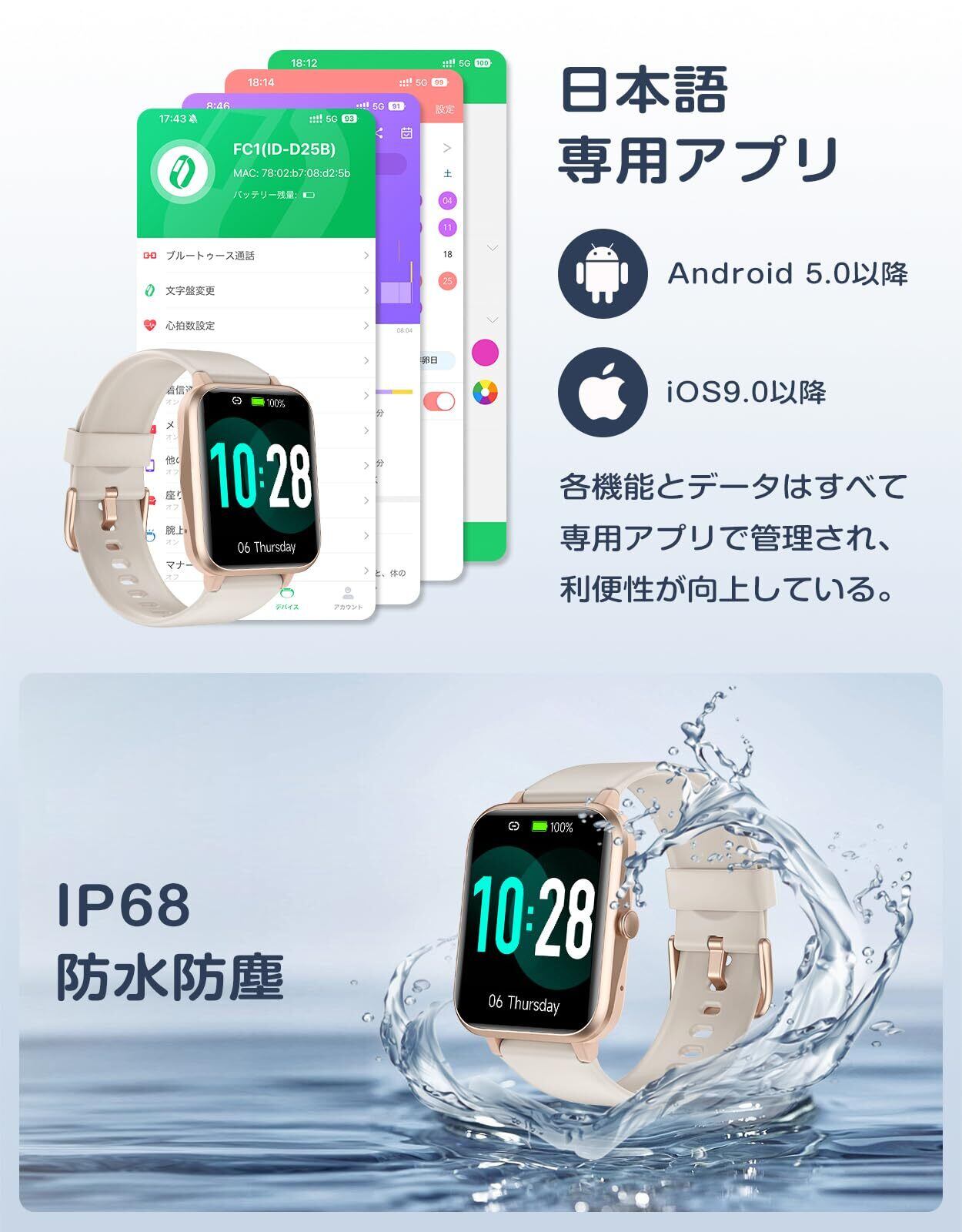 【100種類以上の運動モード&IP68防水防塵】 様々なニーズに応えるため、スマートウォッチには100種類以上の運動モードが搭載されており、一般的な運動のほとんどをカバーしています。運動モード中に音楽コントロールにアクセスすることができ、音楽を聴くのが好きなスポーツマンにおすすめです。毎日の運動データを専用アプリに同期させ、過去のデータをもとにその後の運動スケジュールを調整・計画するのに役立ちます。毎日の成果が一目でわかり、運動による達成感をを楽しめます! IP68等級の防水・防塵性能を備え、防水機能は2m以内の冷たい水中でも作動しますので、 水泳や雨の日、手洗いなども問題ありません。 温水、海水、温水、サウナ、2mを超える水など高温、高圧、腐食性の環境では時計が破損しますのでご注意ください。
