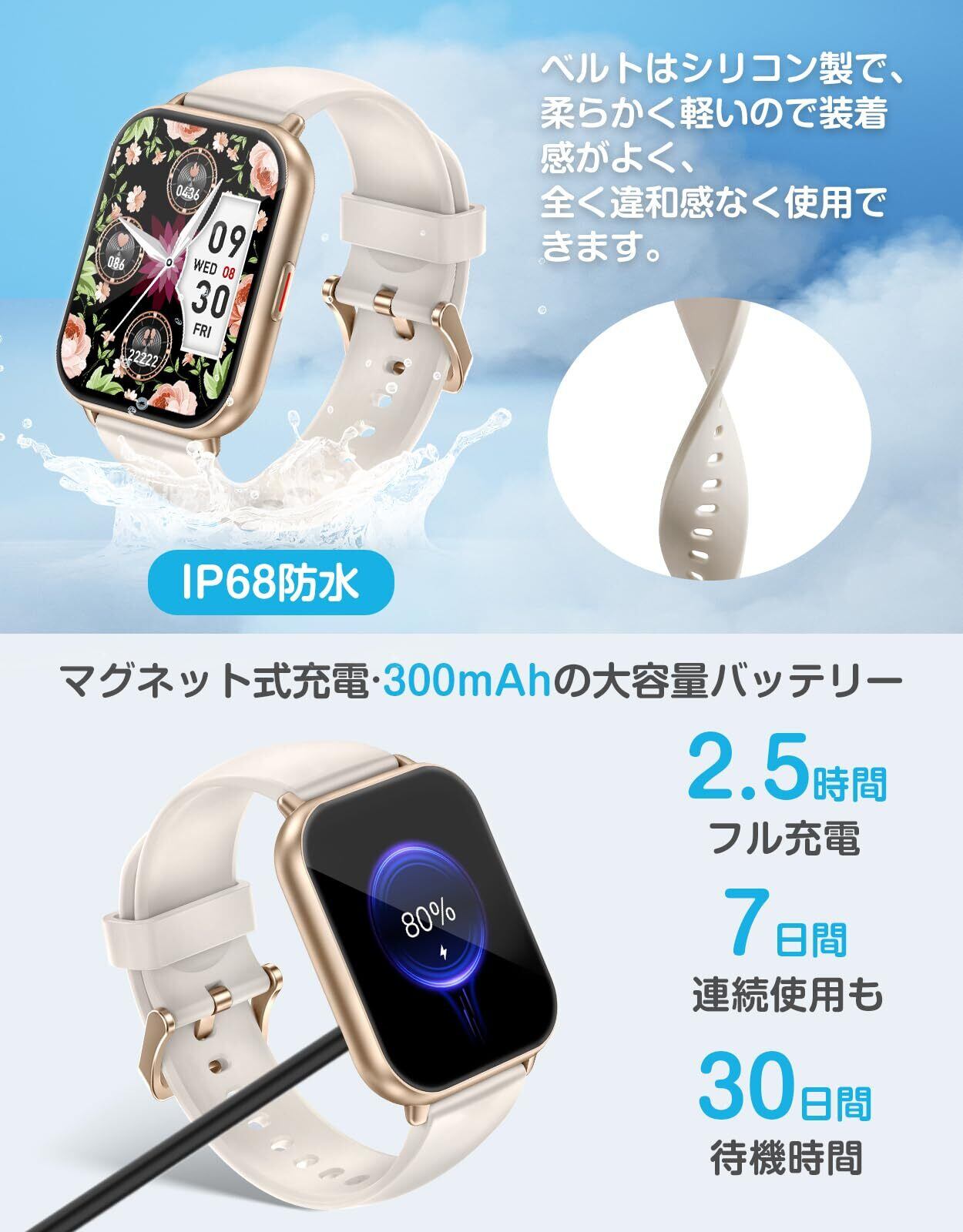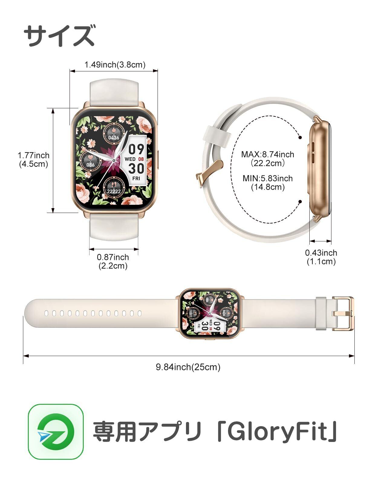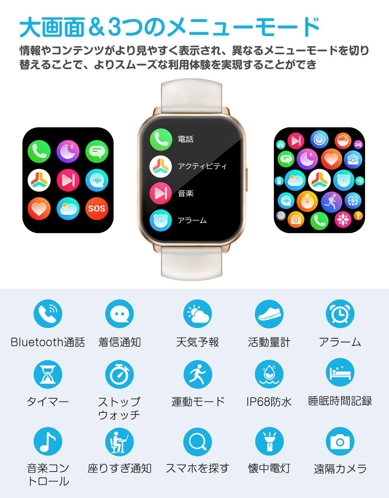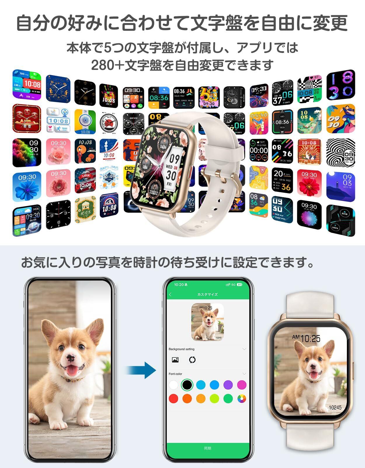 【カスタマイズ文字盤・豊富な機能を搭載】 280種類以上の文字盤デザイン——クラシック、シンプル、クール、かわいいものが揃っています。気分や服装に合わせて時計の文字盤を変えることができ、1日に新鮮さと活力を与えてくれます。このほかオリジナルダイヤルを指定でき、ペットや家族など好きな画像をダイヤルに設定できます。毎日を幸せにします。ストップウォッチ、タイマー、懐中電灯、音楽コントロール、目覚まし時計、座りがちリマインダー、女性の月経周期記録、腕上げ点灯、スマホを探す、明るさ調整など毎日のニーズに応える機能が充実しています。