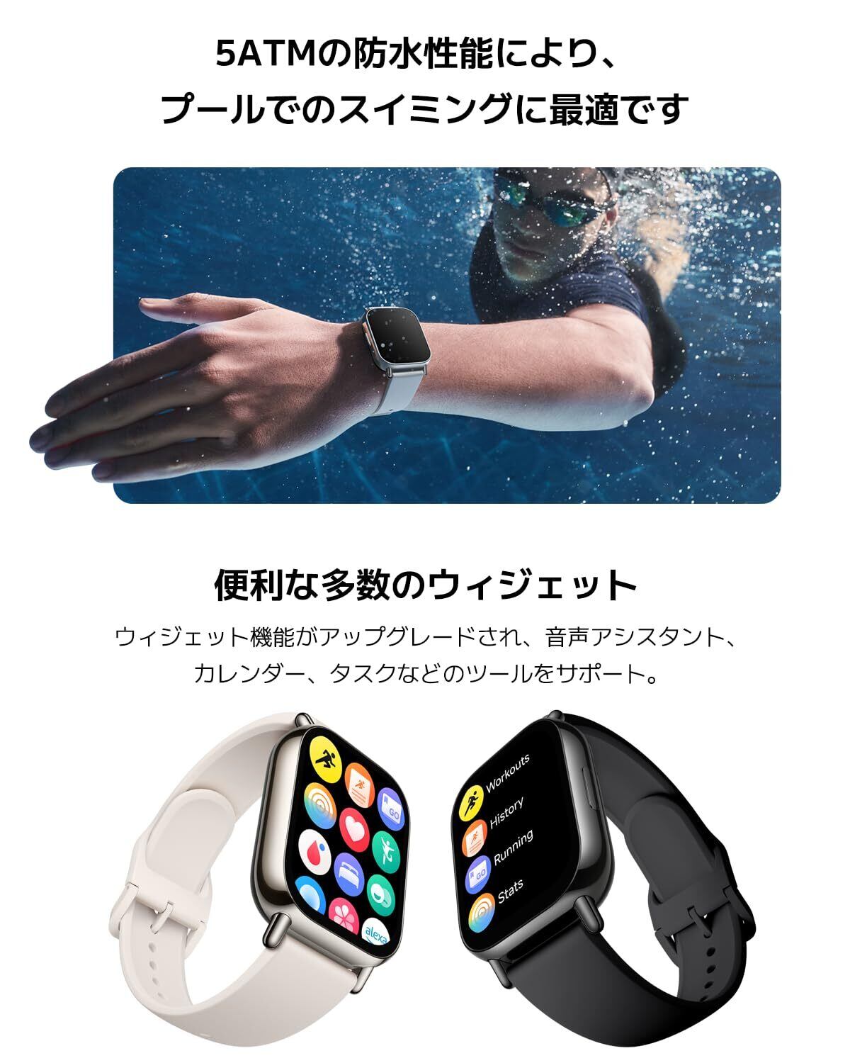 【150種類以上のワークアウトモード】ランニング、ウォーキング、サイクリングなどの基本的なモードに加え、様々なスポーツモードに対応しています。インストラクションに従ってウォーミングアップし、ワークアウトを始めましょう。5ATMの防水性能により、プールでの水泳にも最適です。