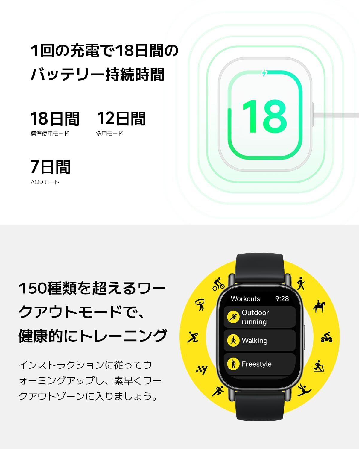 【1.96インチの大型有機ELディスプレイ】1.96インチの鮮明な有機ELディスプレイで、豊かで自然な色を再現。ディスプレイは75.8%の画面占有率を誇ります。AOD(常時画面表示)機能にも対応しており、一日中質の高い体験を提供します。スクエアディスプレイは、光沢度の高いNCVMミドルフレームを使用し、スタイリッシュで軽量設計でワークアウトにぴったりです。
