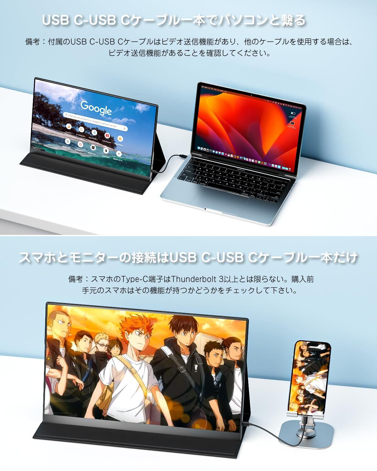 「幅広い互換性」モバイルディスプレイはサブディスプレイとして機能し、効率を向上させることができます。ラップトップ、PC、Mac、スマートフォン、PS4/PS5、XBOX、Switchなどと幅広く互換性があり、ビジネス、旅行、エンターテイメントに最適です。携帯電話を使用する場合、全機能Type Cポートなスマホが必要なので、ご注意下さいませ。