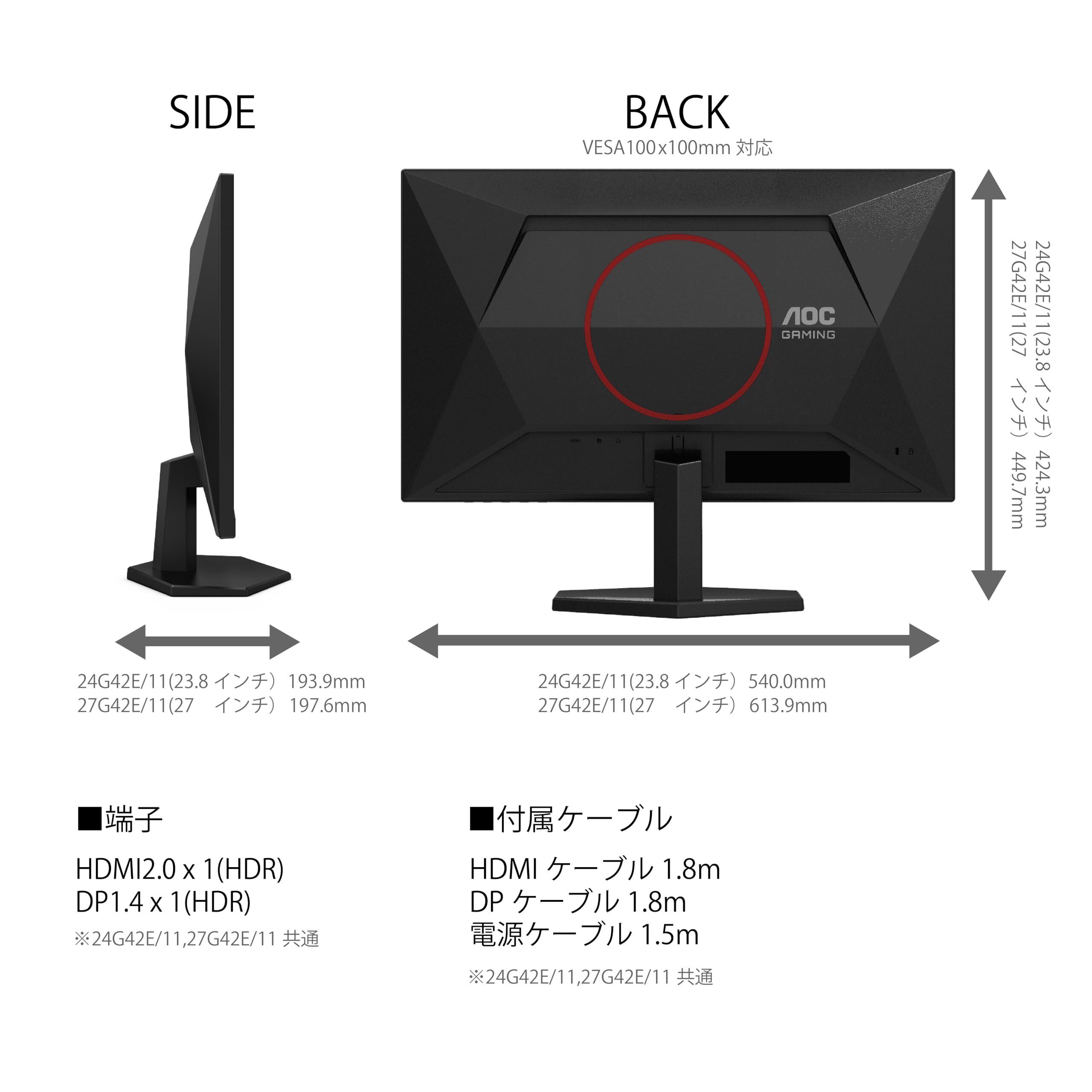 AOC ゲーミングモニター 24G42E/11, 23.8インチ, フルHD/1920×1080@180Hz, 応答速度0.5ms(MPRT), Fast IPS, HDMI2.0 x 1/ DP1.4x1,ブルーライト低減, フリッカーフリー, Adaptive Sync, HDR10対応, 3年