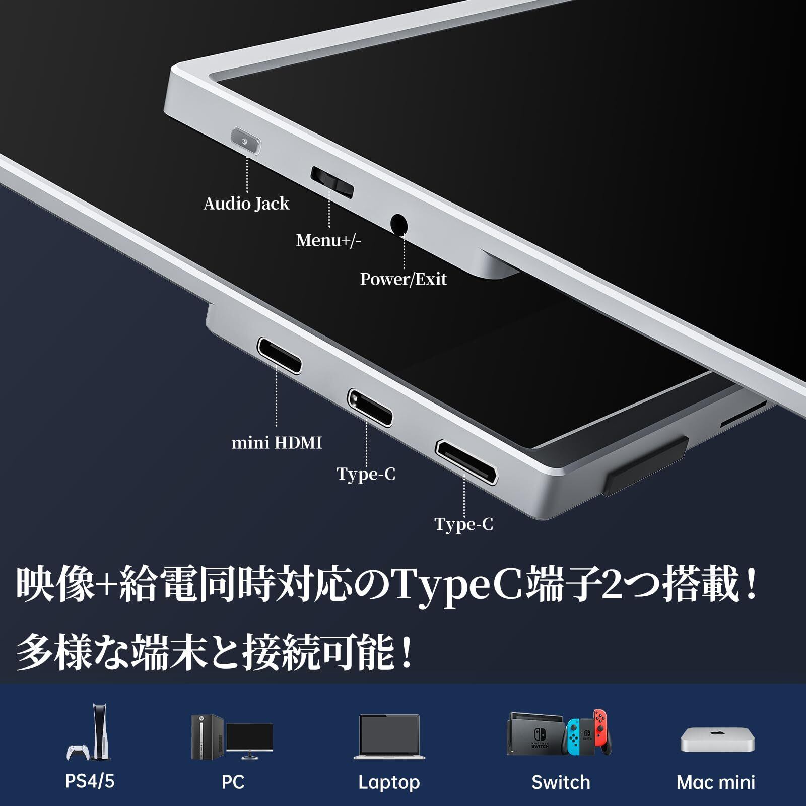 【ケーブル一本だけで接続可能・アスペクト比自動適合】miniHDMI、Type-C二つ、3.5mmイヤホン、豊富な入力端子をもって多様な接続方法を実現。何よりも便利なのは、Type-Cケーブル一本で映像出力と給電を同時に実現できます、しかも二つのType-C端子とも信号転送+給電両対応。Type C端子で接続できない端末は、HDMI接続との選択肢があります。両端子とも対応している端末なら自由に接続できます。モニター自体のアスペクト比は3:2ですが、自動適合できますので、16:9のデバイス(例えばswitch)と繋いでも、画像変形はしません!
