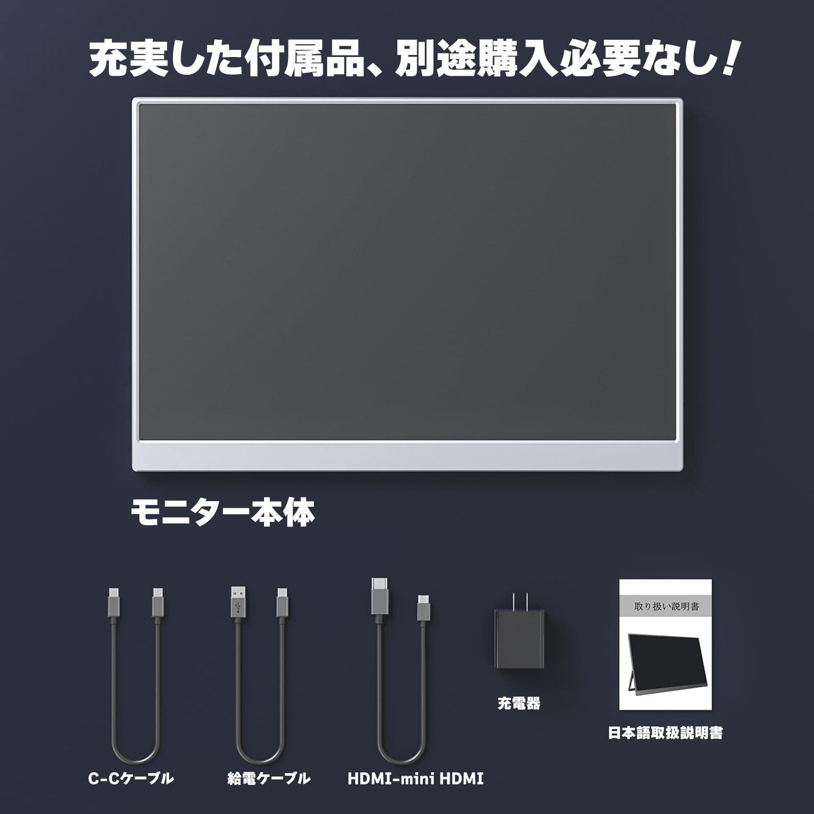 【購入前に必見!】①Type Cケーブル一本で接続する場合、接続の端末がDP ALT MODE(映像出力)に対応しなければなりません。②給電後、「信号なし」が出ること自体は正常な現象です、映像ケーブルがしっかり挿されているか、(C-Cケーブルで接続する場合)接続機器のCポートが映像出力可能かをご確認ください。③接続の端末から電源を取る場合、端末の電力低下で給電不足になることもあります。この場合、電源アダプターで給電してください。④同時に給電・映像転送可能なC-Cケーブルが付属されていますが、買い足しの場合、映像転送可能なものにしてください。⑤HDMIで繋ぐ場合、HDMIケーブルは電源供給できませんので、同時電源ケーブルも繋いでください。⑥モニターにバッテリーが内蔵されていませんので、使用しない時には充電不要で、使用する時に給電が必要です。⑦switch 2との互換性はまだ調整できておらず、TypeCで接続できません。ドック経由でHDMIで繋いでください。