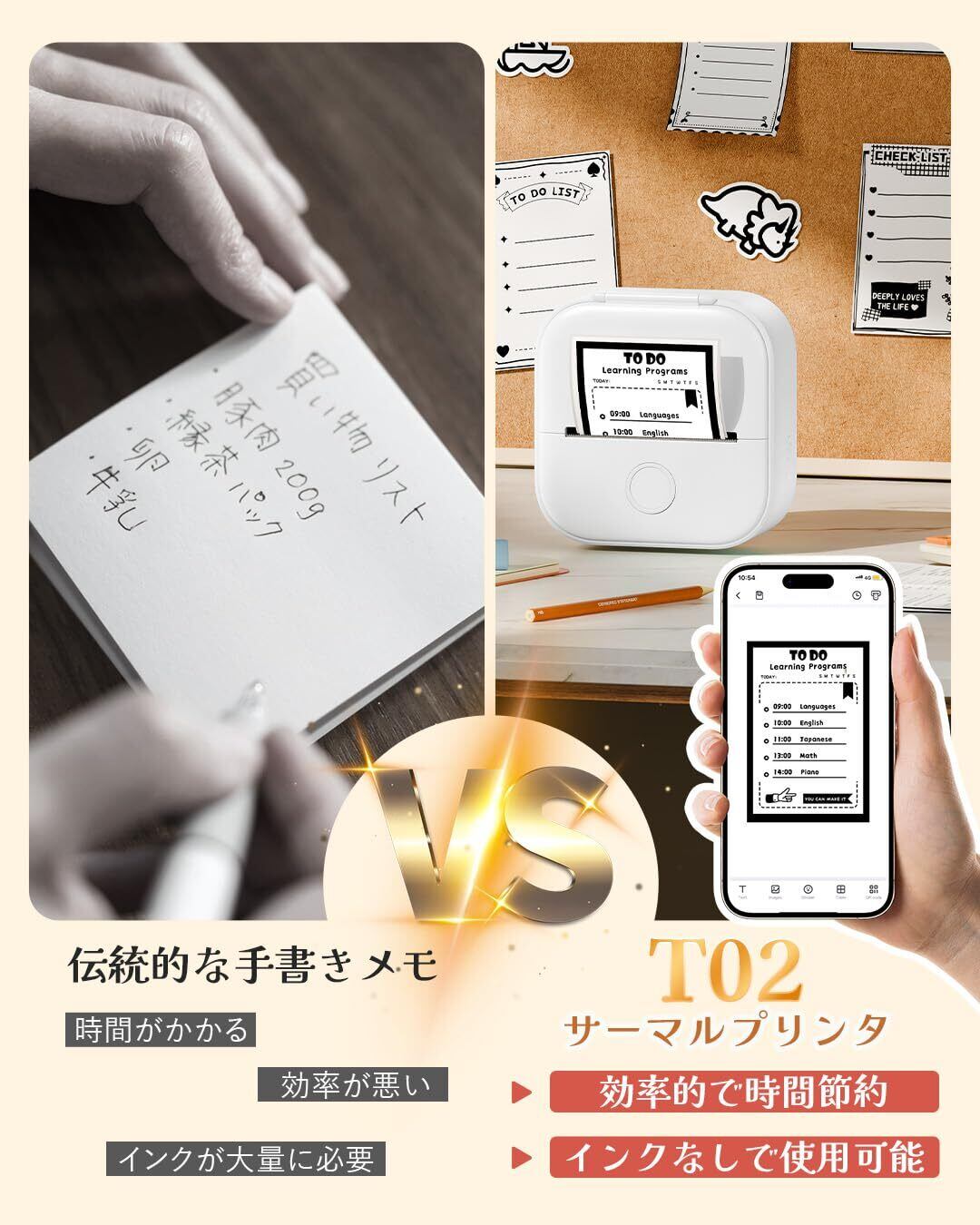 多用途サーマルプリンター- T02ノートプリンターで印刷体験をアップグレードしましょう。多用途性と比類のない携帯性を提供するコンパクトなインクレスプリンターです。感熱印刷技術により、写真、テキスト、さまざまなステッカーデザインを簡単に印刷できます。感熱印刷のパワーを実感し、新たな利便性をお楽しみください!