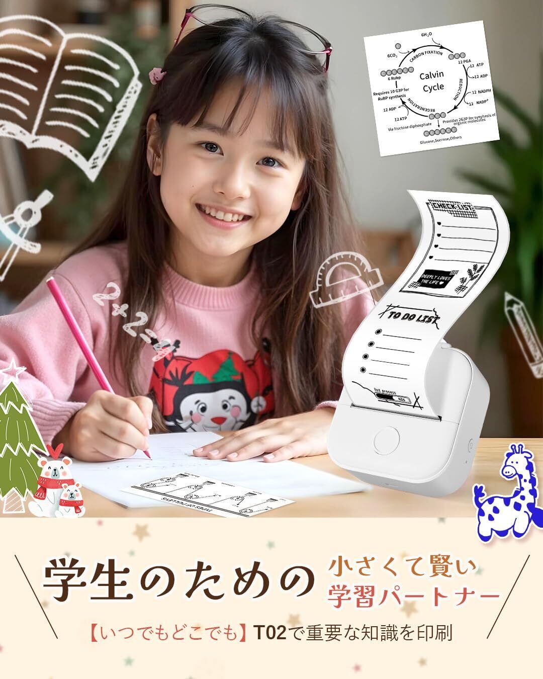 ミニプリンタ-ポータブル&多用途サーマルプリンタ。T02ミニプリンタは、コンパクトで多用途なインクレスプリンタです。外出先で写真やテキスト、ステッカーを印刷する必要がある学生やクリエイティブな方に最適です。ミニデザインで持ち運びが容易なため、ポケットサイズのサーマルプリンタとして理想的です