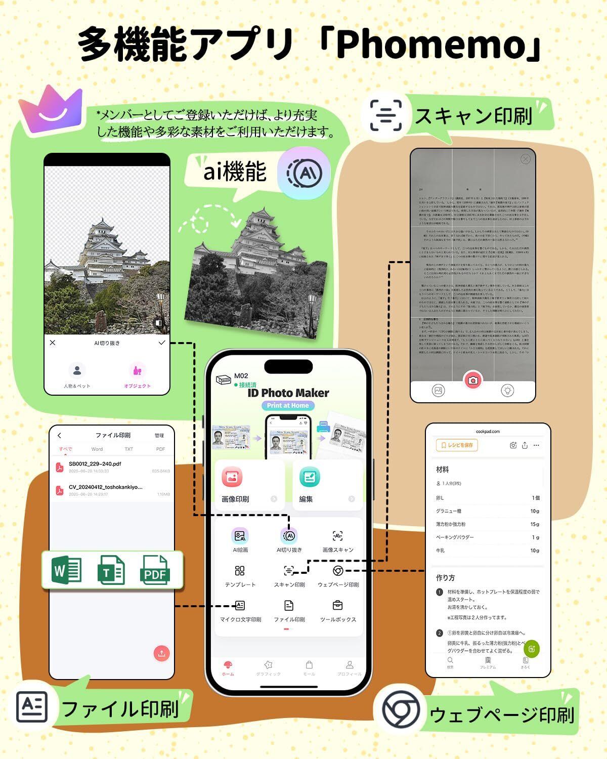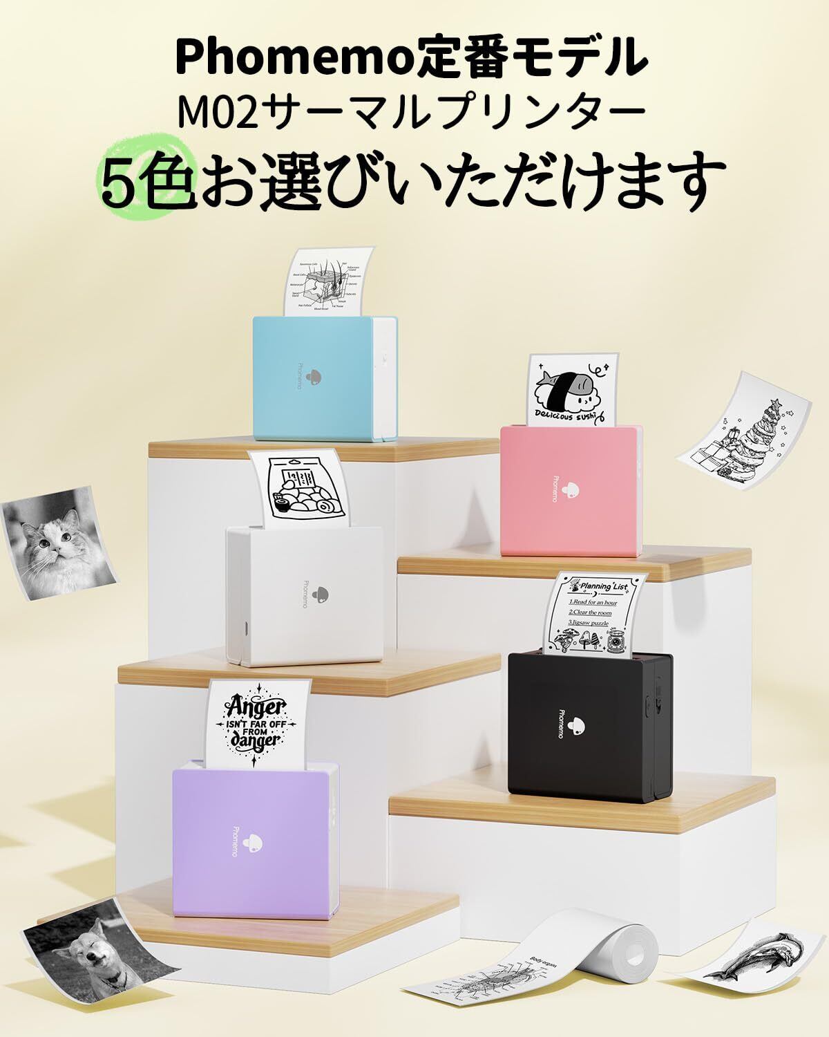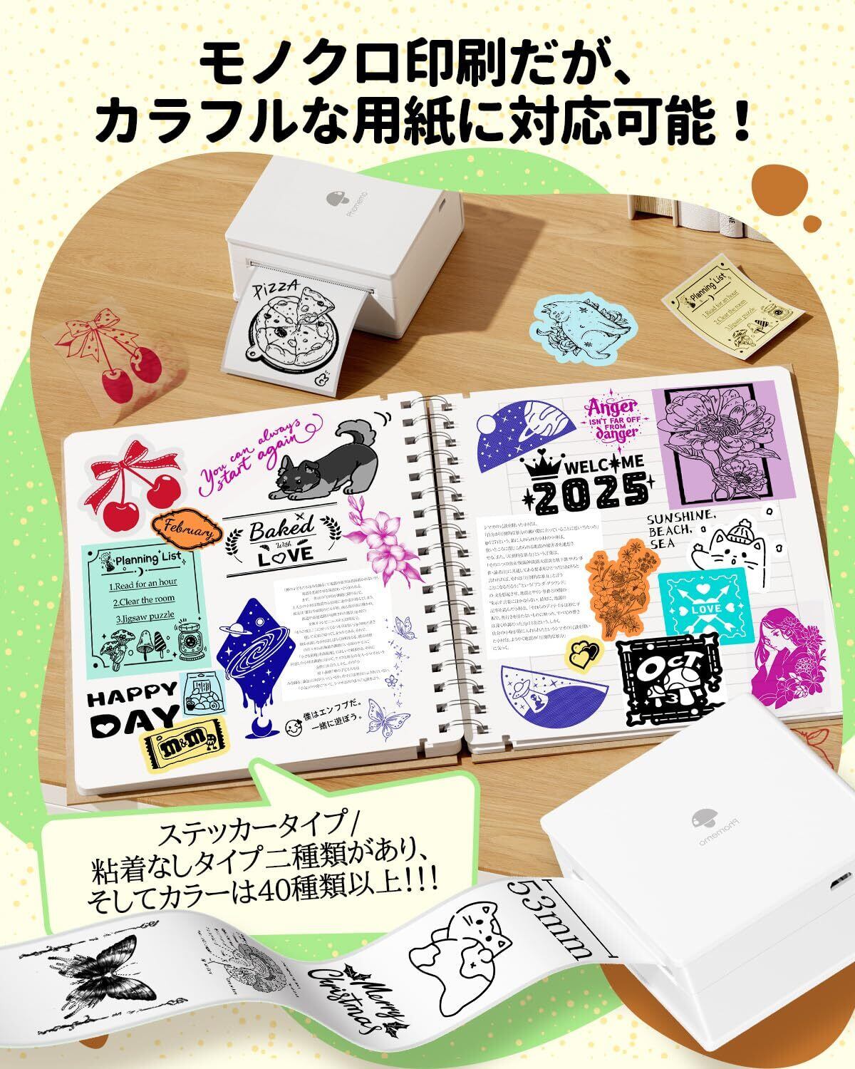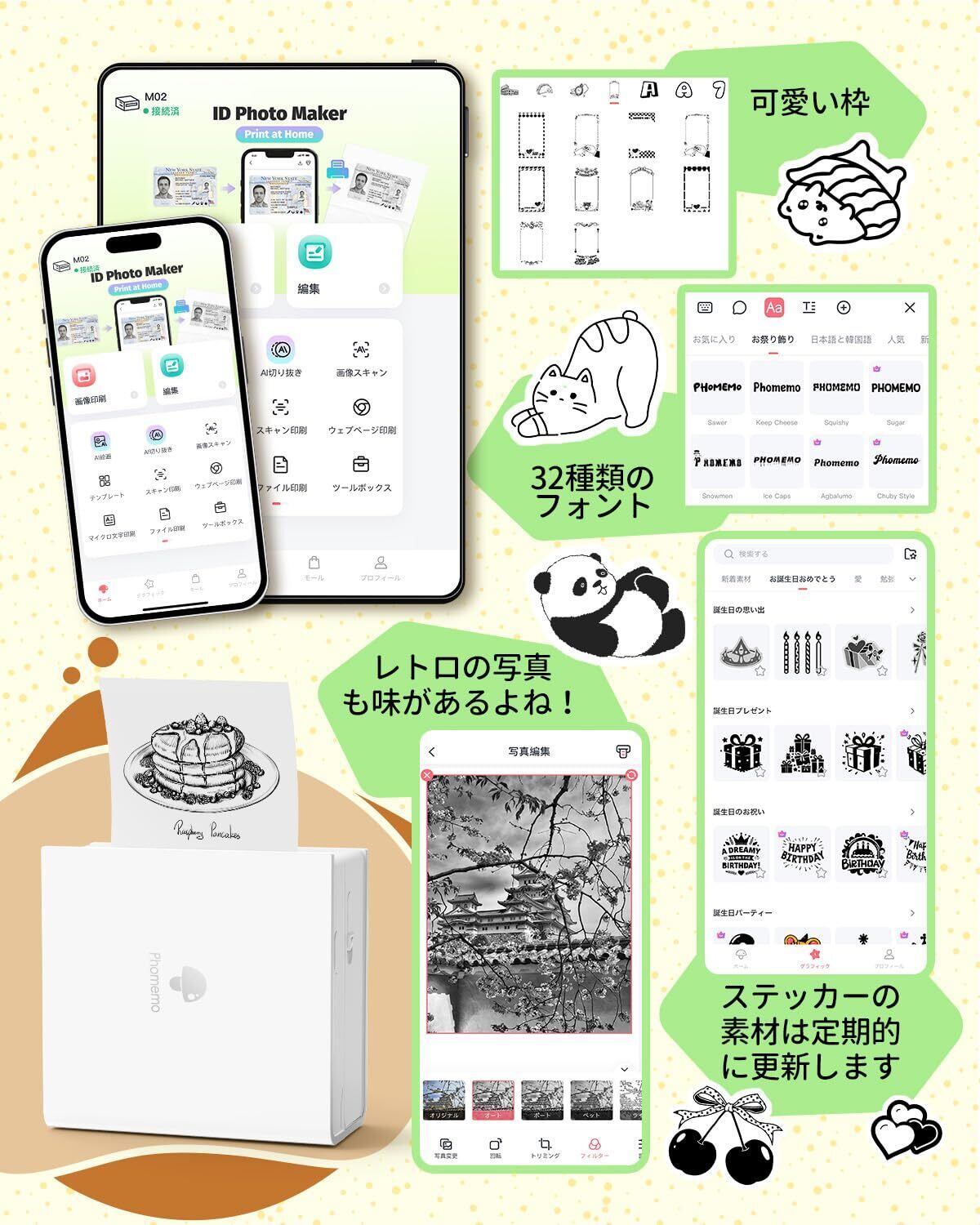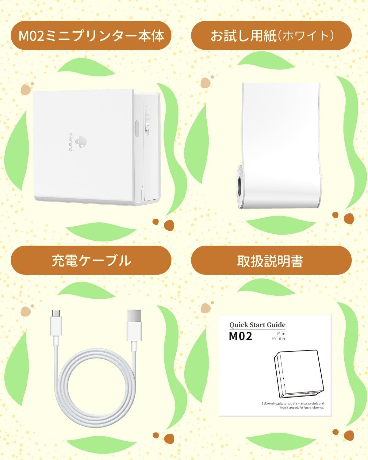 Phomemo M02は、サーマルル式 ミニプリンターです。スマホのBluetooth機能を介して、無料専用アプリ「Phomemo」を接続します。さまざまな機能を簡単に使用して、かわいいシール、ビンテージ写真、メモと整理収納ラベルを印刷します